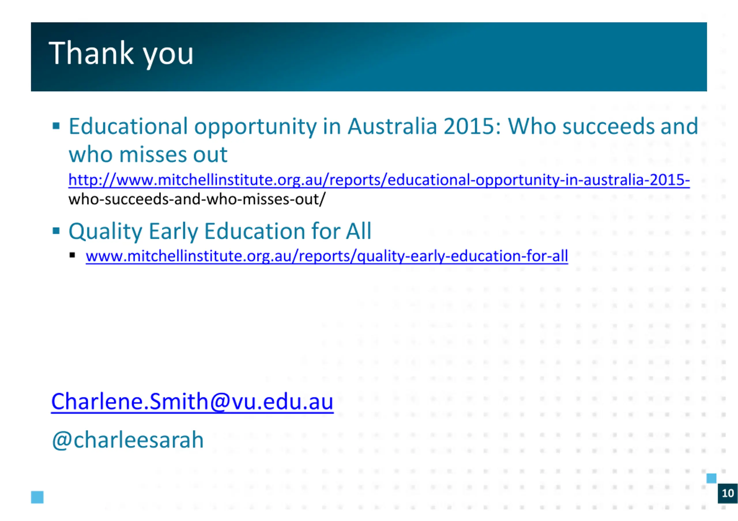 Thank you Educational opportunity in Australia 2015: Who succeedsand who misses out http://www.mitchellinstitute.org.au/reports/educational-opportunity-in-australia-2015- who-succeeds-and-who-misses-out/ Quality Early Education forAll www.mitchellinstitute.org.au/reports/quality-early-education-for-all Charlene.Smith@vu.edu.au @charleesarah 10