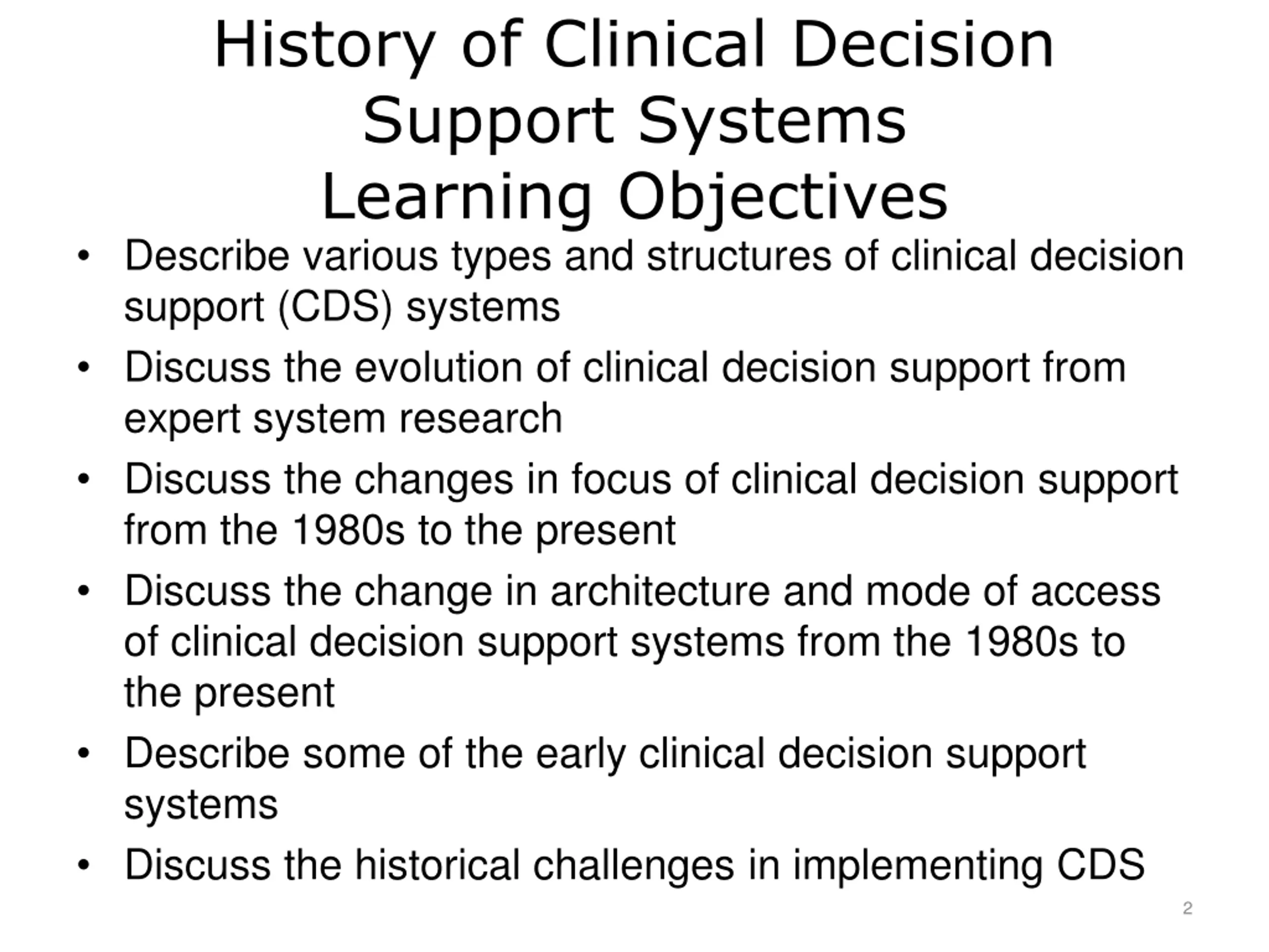 History of Clinical Decision Support Systems Learning Objectives Describe various types and structures of clinical decision support (CDS) systems Discuss the evolution of clinical decision support from expert system research Discuss the changes in focus of clinical decision support from the 1980s to the present Discuss the change in architecture and mode of access of clinical decision support systems from the 1980s to the present Describe some of the early clinical decision support systems Discuss the historical challenges in implementing CDS 2