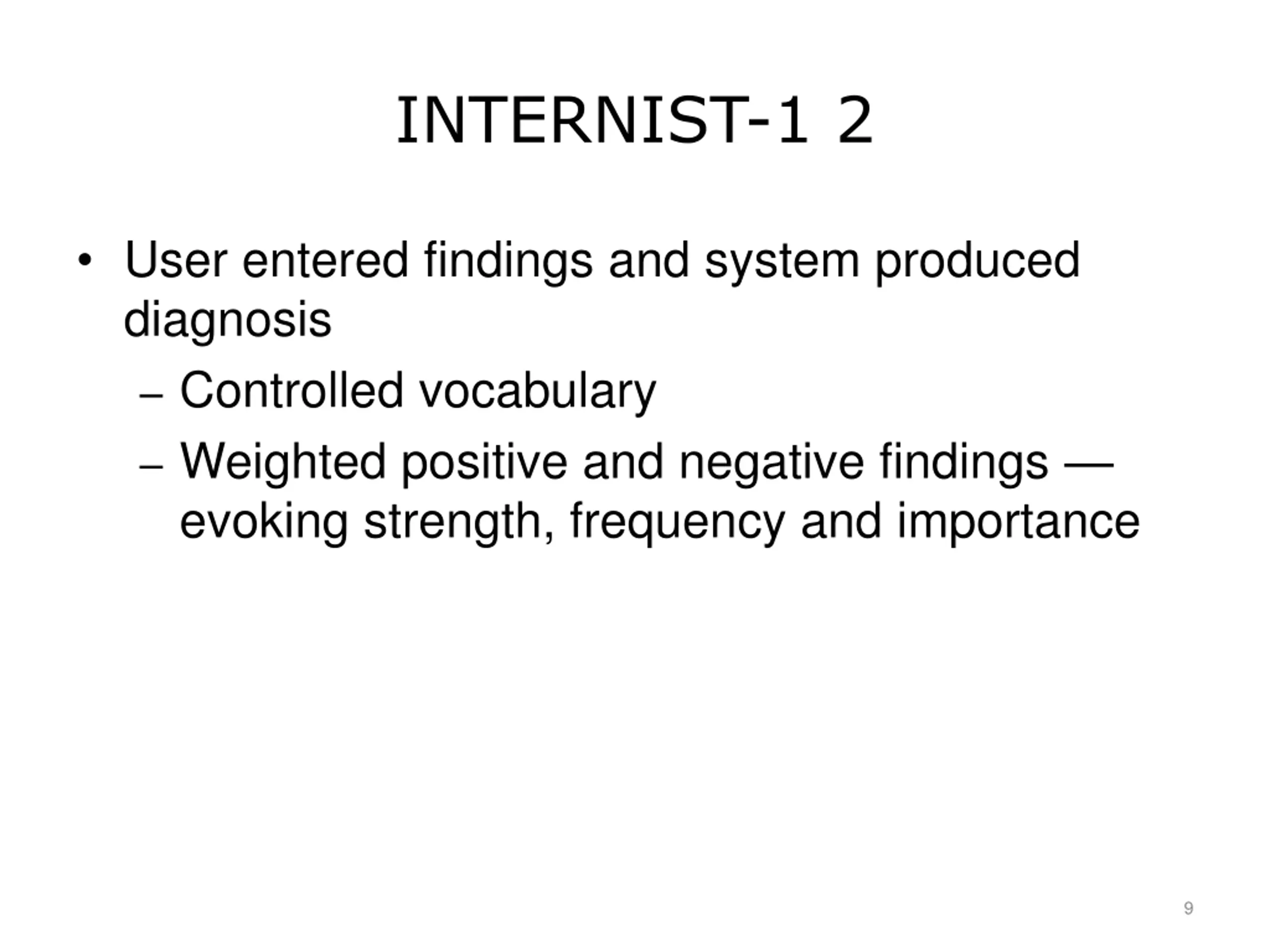INTERNIST-1 2 User entered findings and system produced diagnosis Controlled vocabulary Weighted positive and negative findings evoking strength, frequency and importance 9