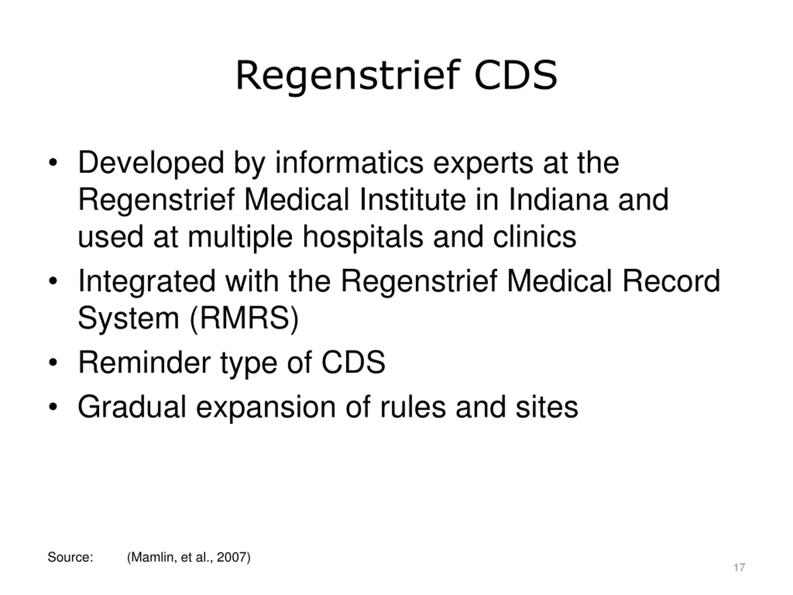Regenstrief CDS Developed by informatics experts at the Regenstrief Medical Institute in Indiana and used at multiple hospitals and clinics Integrated with the Regenstrief Medical Record System (RMRS) Reminder type of CDS Gradual expansion of rules and sites Source: (Mamlin, et al., 2007) 17