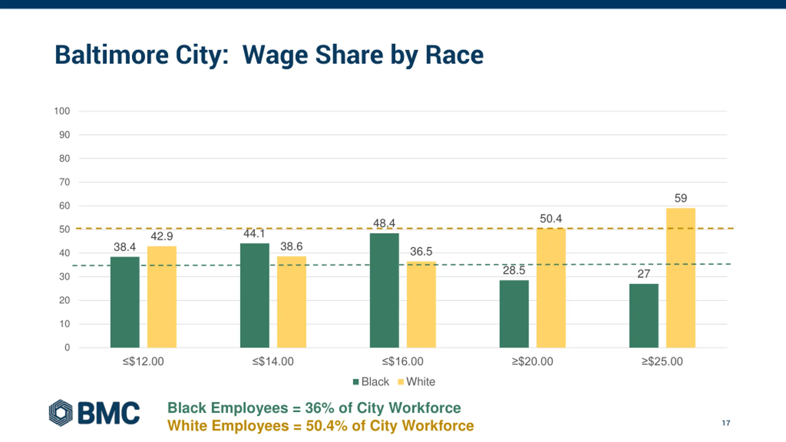 Baltimore City: Wage Share by Race 100 90 80 70 59 60 50.4 48.4 50 44.1 42.9 38.6 38.4 36.5 40 28.5 27 30 20 10 0 $12.00 $14.00 $16.00 $20.00 $25.00 Black White Black Employees = 36% of City Workforce White Employees = 50.4% of City Workforce 17