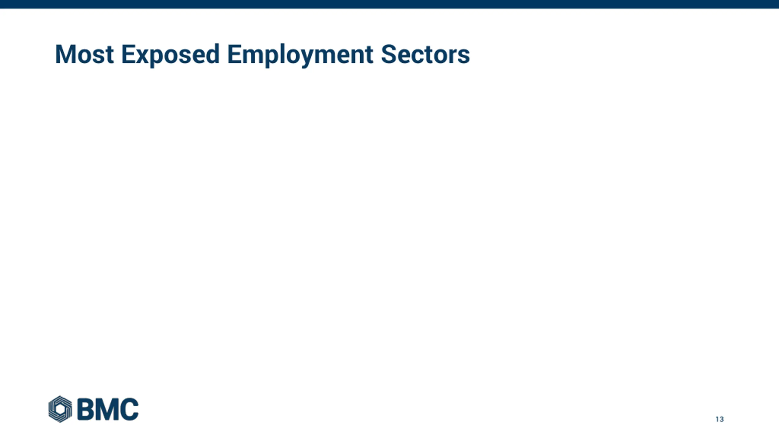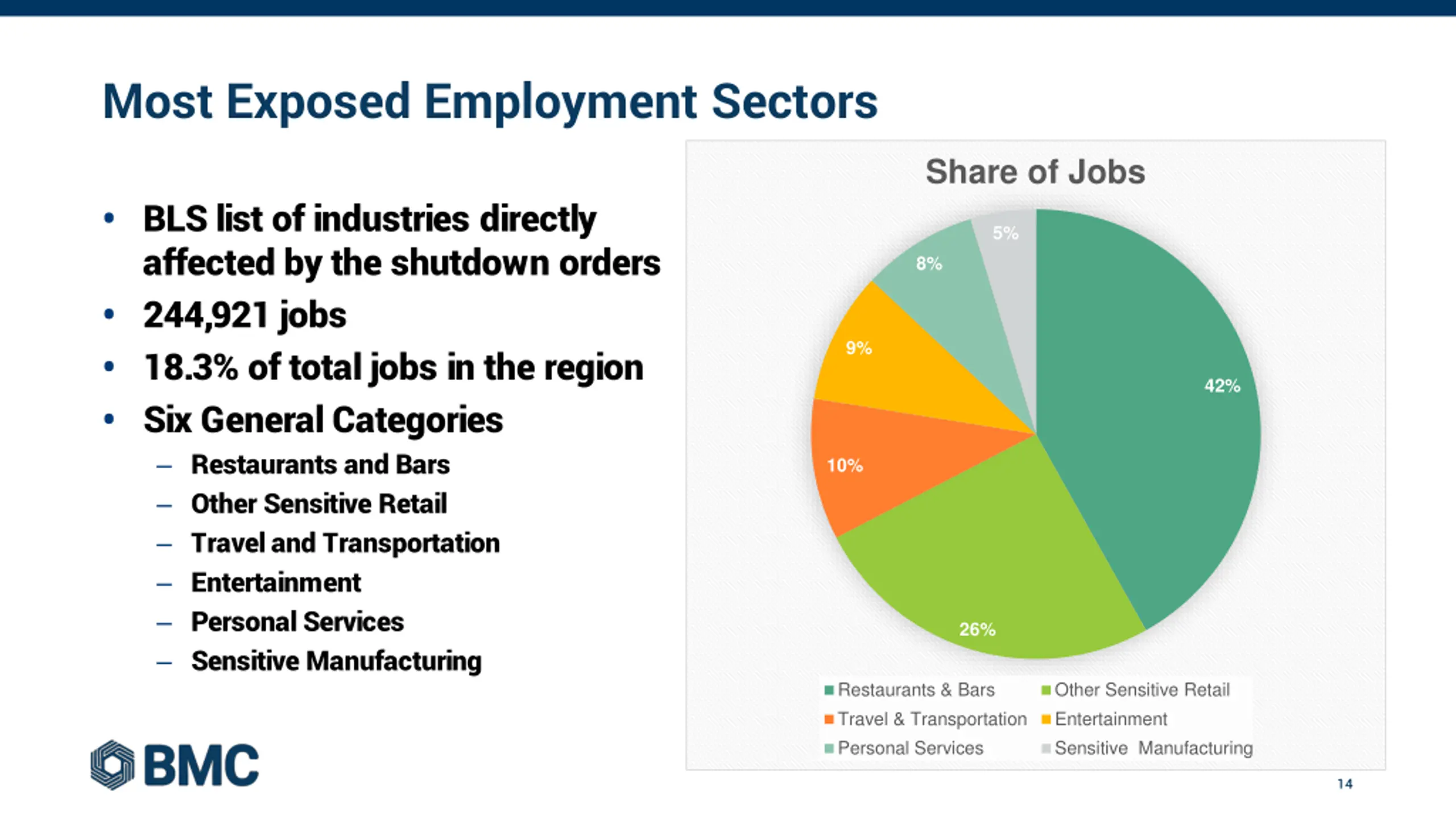 Most Exposed Employment Sectors Share of Jobs BLS list of industries directly affected by the shutdown orders 244,921 jobs 18.3% of total jobs in the region Six General Categories Restaurants and Bars Other Sensitive Retail Travel and Transportation Entertainment Personal Services Sensitive Manufacturing 5% 8% 9% 42% 10% 26% Restaurants & Bars Travel & Transportation Personal Services Other Sensitive Retail Entertainment Sensitive Manufacturing 14