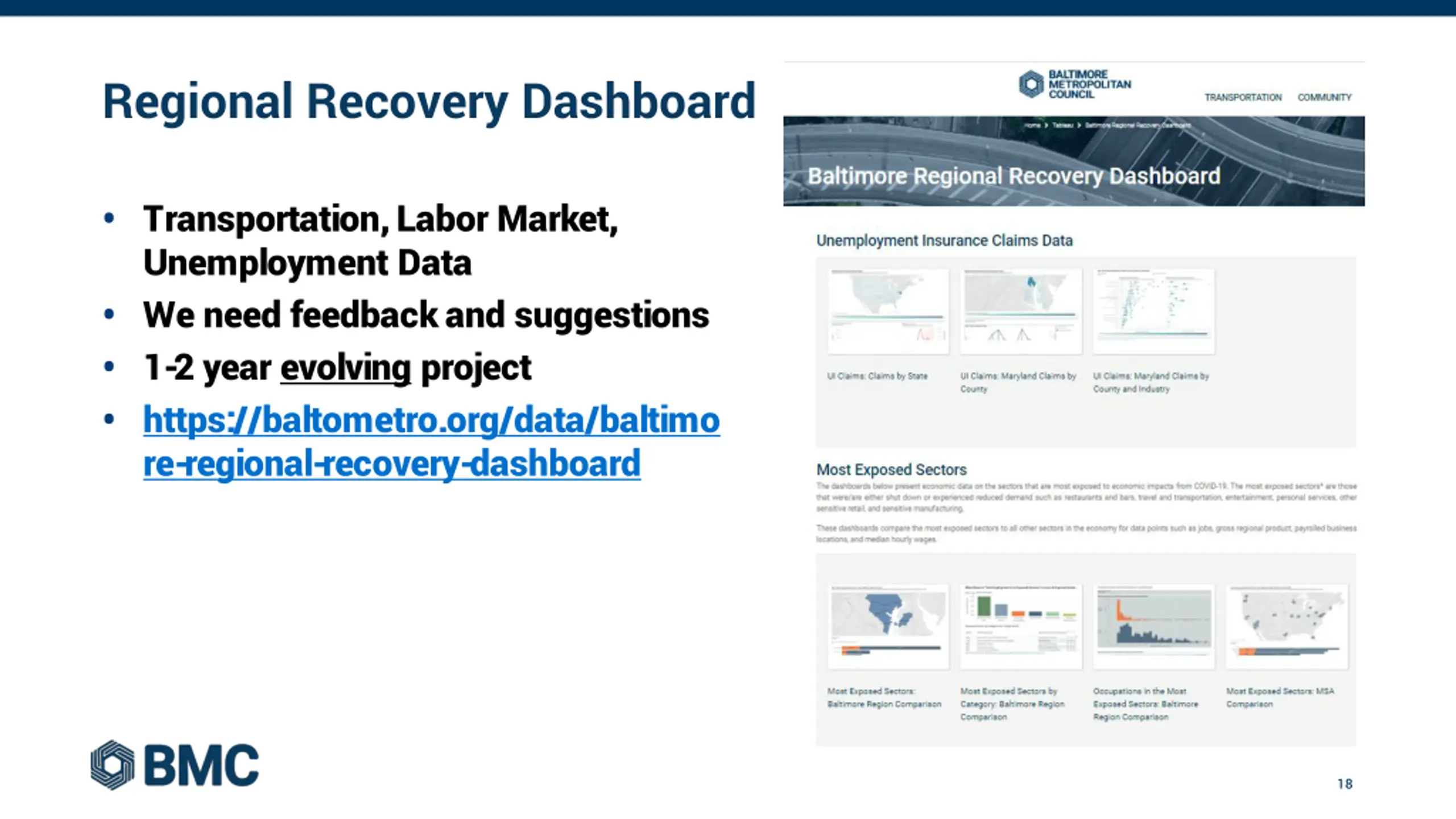 Regional Recovery Dashboard Transportation, Labor Market, Unemployment Data We need feedback and suggestions 1-2 year evolving project https://baltometro.org/data/baltimo re-regional-recovery-dashboard 18