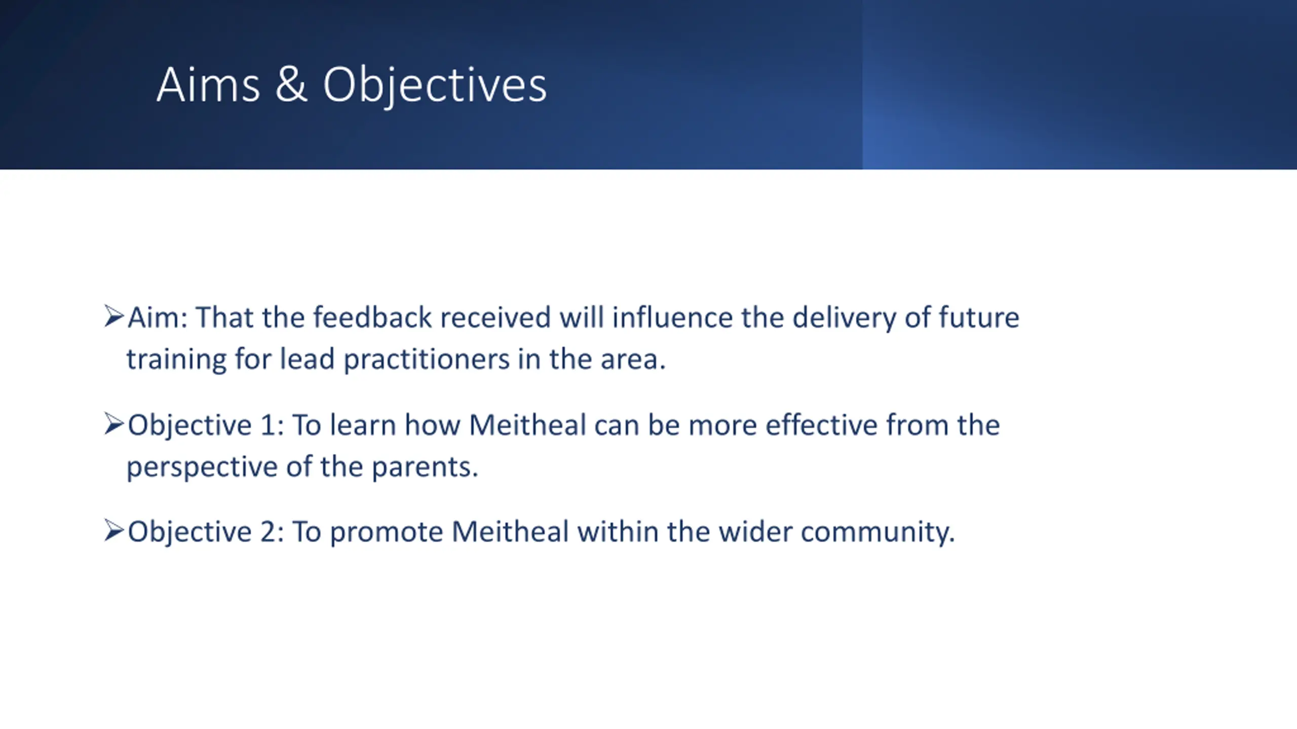 Aims & Objectives Aim: That the feedback received will influence the delivery of future training for lead practitioners in the area. Objective 1: To learn how Meitheal can be more effective from the perspective of the parents. Objective 2: To promote Meitheal within the wider community.