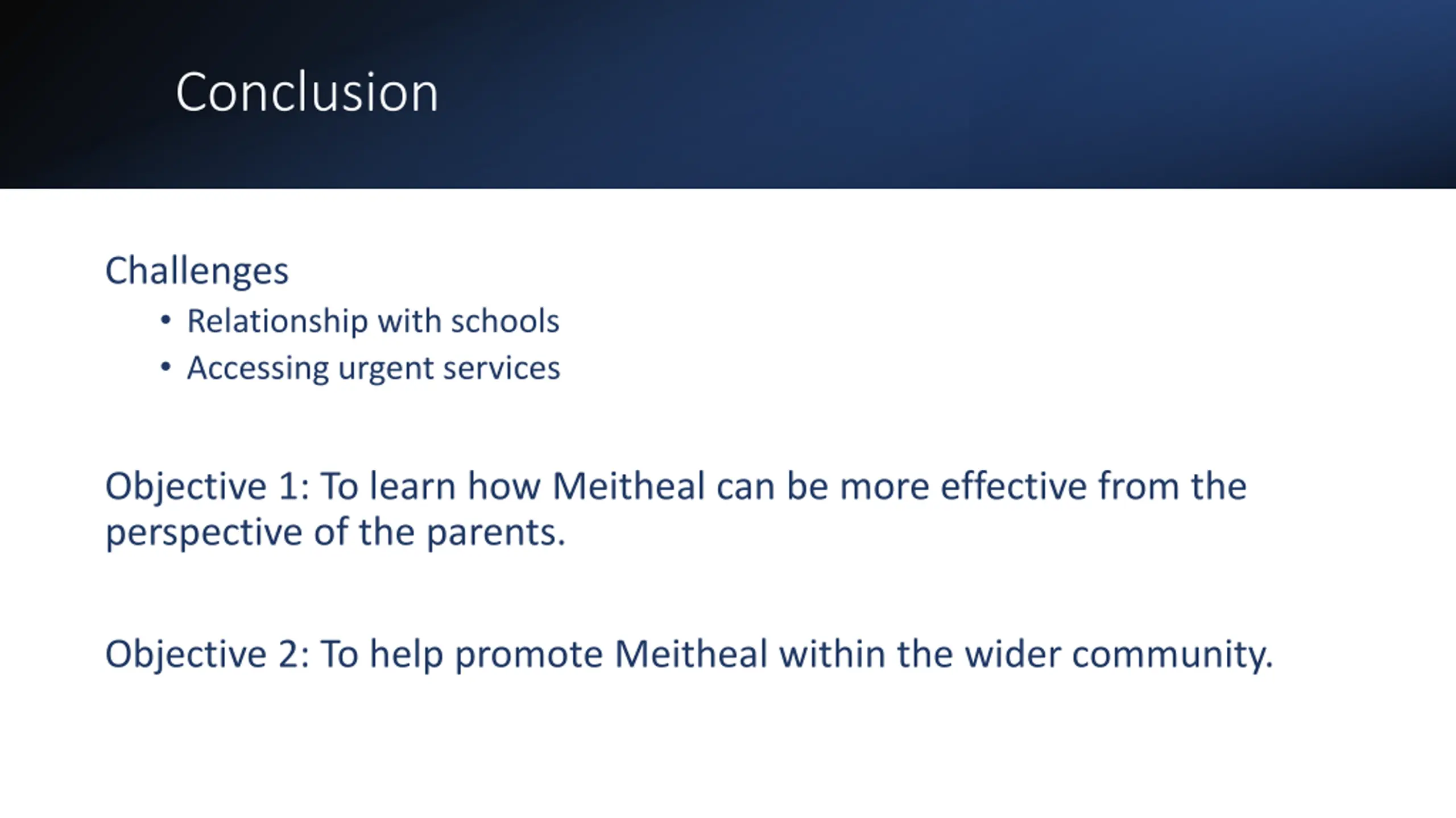 Conclusion Challenges Relationship with schools Accessing urgent services Objective 1: To learn how Meitheal can be more effective from the perspective of the parents. Objective 2: To help promote Meitheal within the wider community.