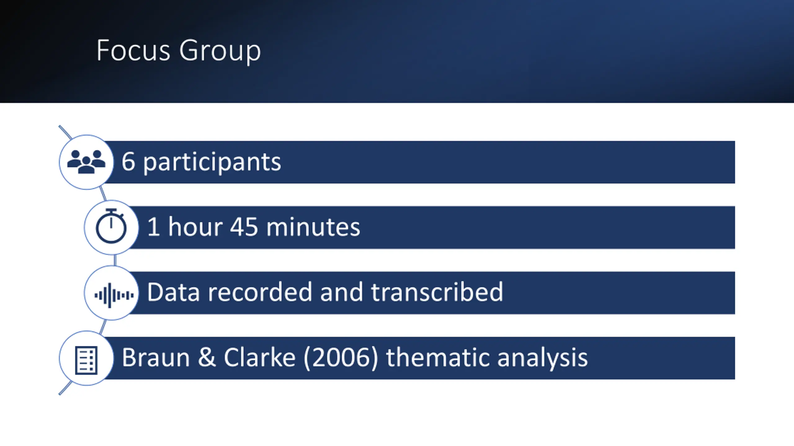 Focus Group 6 participants 1 hour 45 minutes Data recorded and transcribed Braun & Clarke (2006) thematic analysis