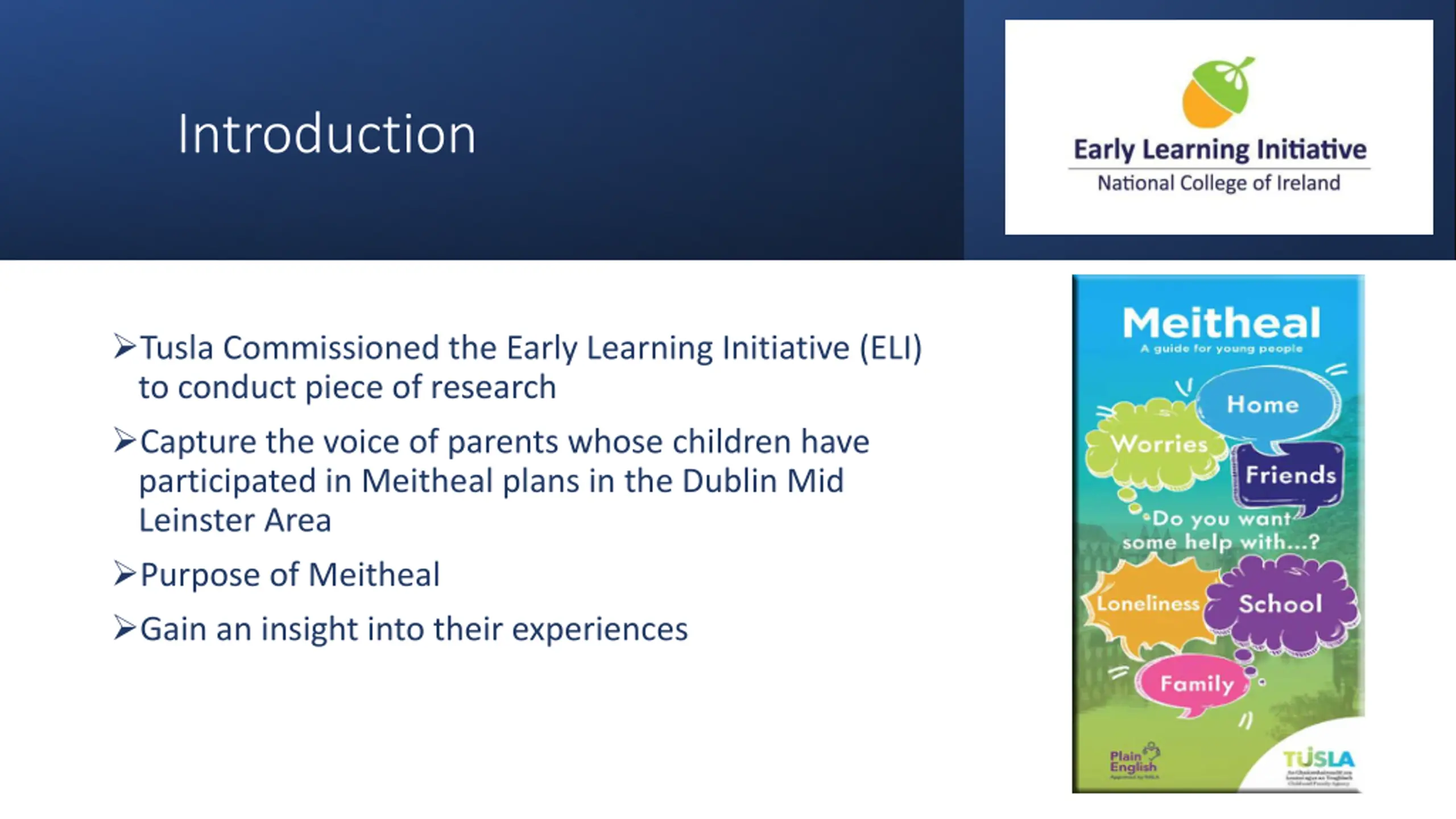Introduction Tusla Commissioned the Early Learning Initiative (ELI) to conduct piece of research Capture the voice of parents whose children have participated in Meitheal plans in the Dublin Mid Leinster Area Purpose of Meitheal Gain an insight into their experiences