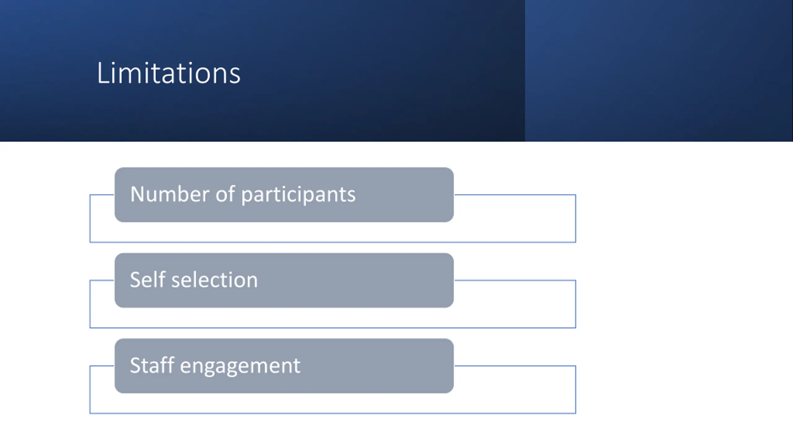 Limitations Number of participants Self selection Staff engagement
