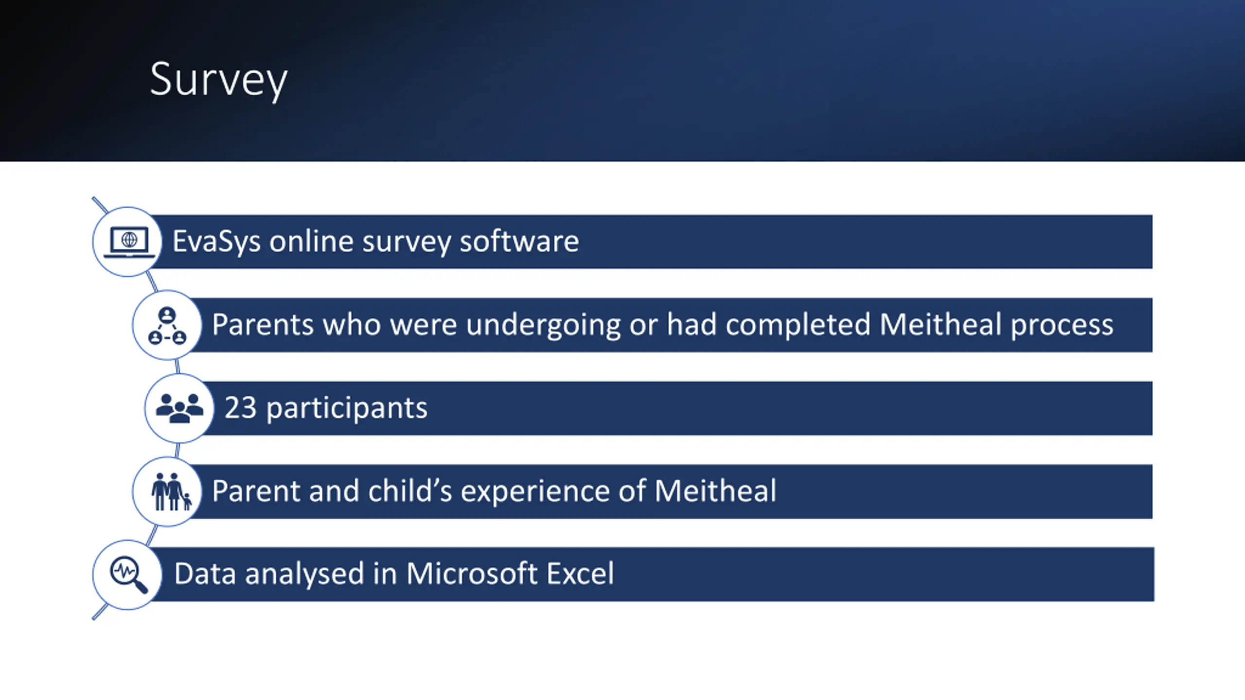 Survey EvaSys online survey software Parents who were undergoing or had completed Meitheal process 23 participants Parent and child s experience of Meitheal Data analysed in Microsoft Excel