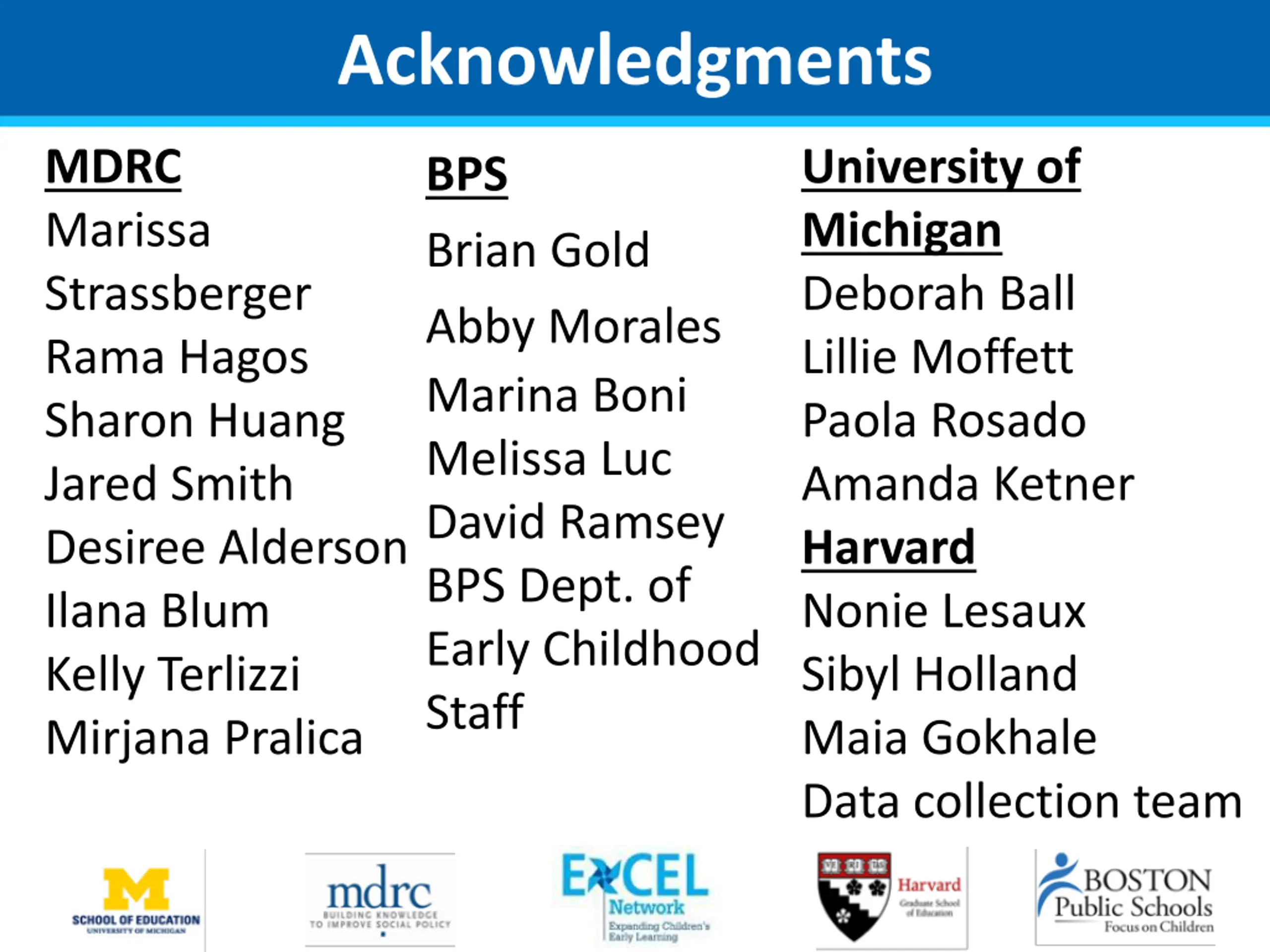 Acknowledgments MDRC Marissa Strassberger Rama Hagos Sharon Huang Jared Smith Desiree Alderson Ilana Blum Kelly Terlizzi Mirjana Pralica University of Michigan Deborah Ball Lillie Moffett Paola Rosado Amanda Ketner Harvard Nonie Lesaux Sibyl Holland Maia Gokhale Data collection team BPS Brian Gold Abby Morales Marina Boni Melissa Luc David Ramsey BPS Dept. of Early Childhood Staff