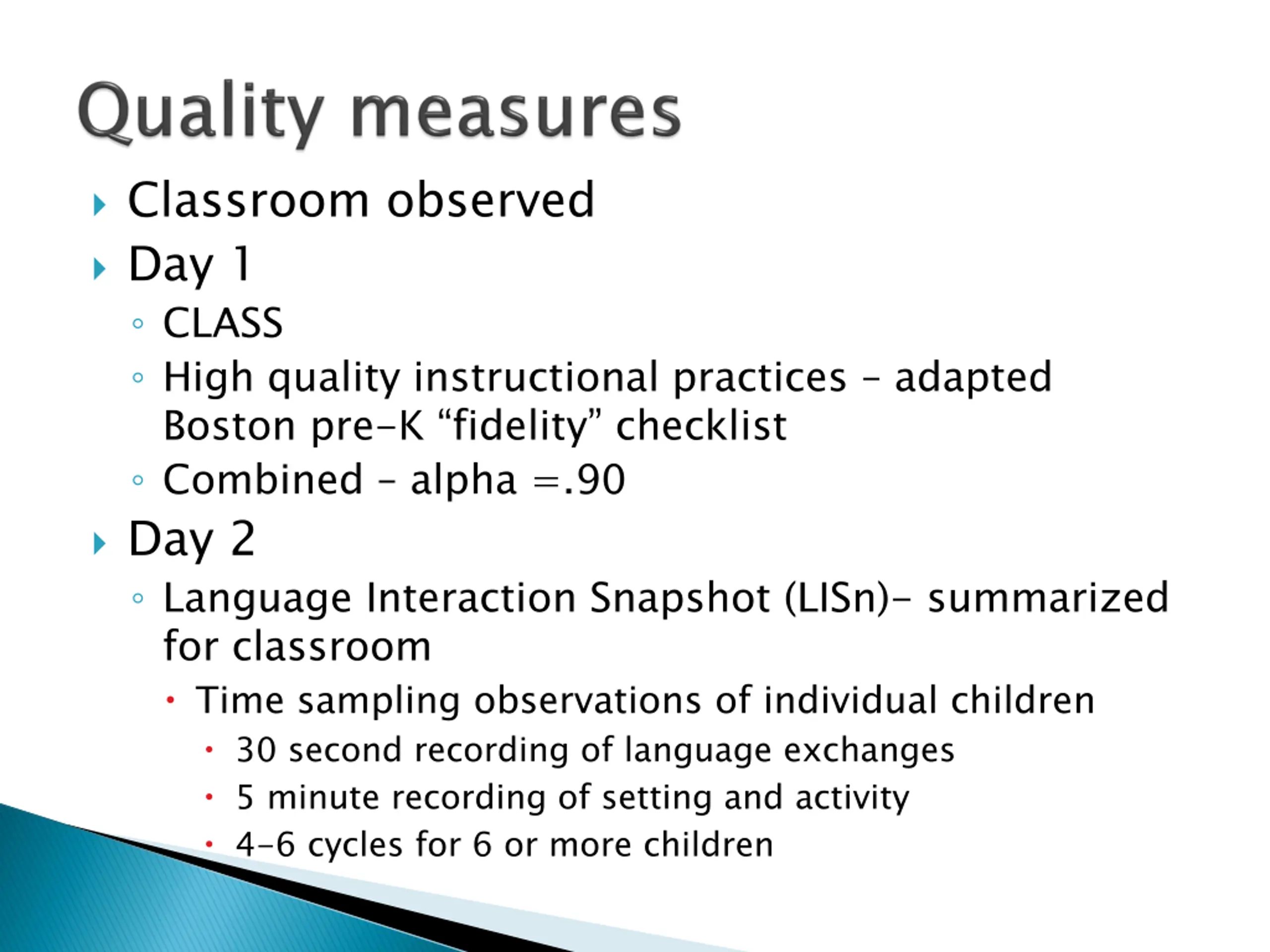 Classroom observed Day 1 CLASS High quality instructional practices adapted Boston pre-K fidelity checklist Combined alpha =.90 Day 2 Language Interaction Snapshot (LISn)- summarized for classroom Time sampling observations of individual children 30 second recording of language exchanges 5 minute recording of setting and activity 4-6 cycles for 6 or more children