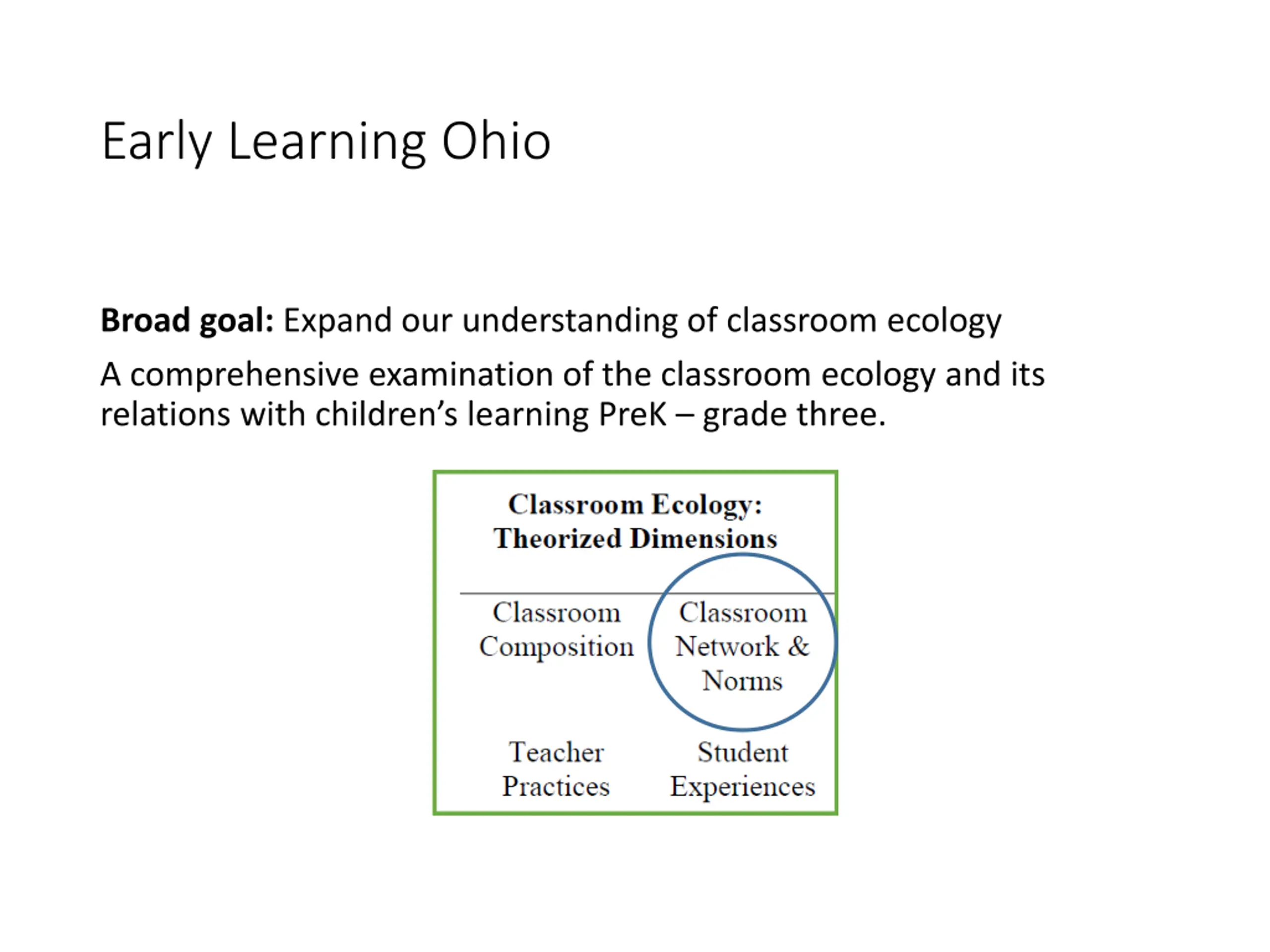 Early Learning Ohio Broad goal: Expand our understanding of classroom ecology A comprehensive examination of the classroom ecology and its relations with children s learning PreK grade three.