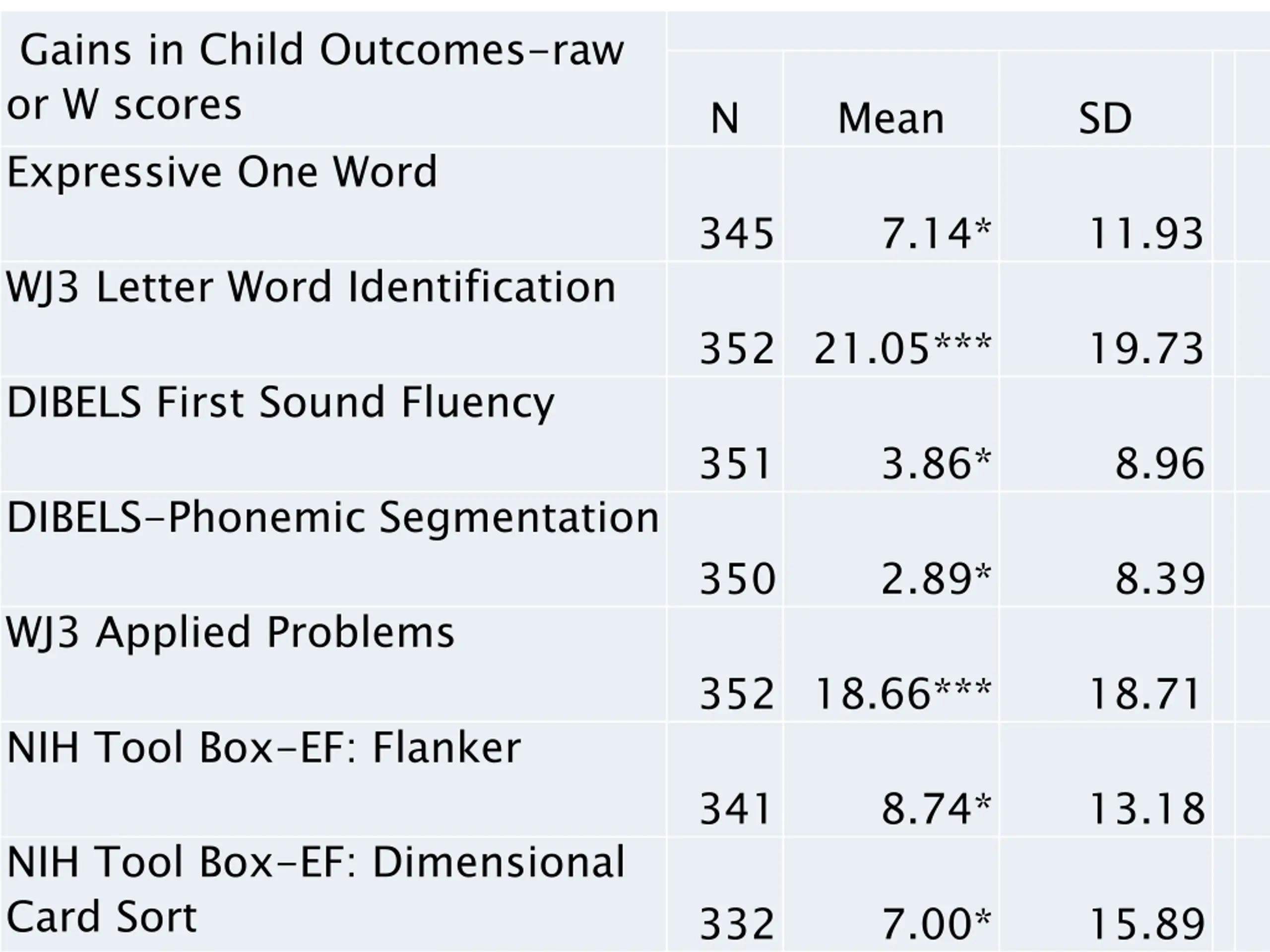 Gains in Child Outcomes-raw or W scores Expressive One Word N Mean SD 345 7.14* 11.93 WJ3 Letter Word Identification 352 21.05*** 19.73 DIBELS First Sound Fluency 351 3.86* 8.96 DIBELS-Phonemic Segmentation 350 2.89* 8.39 WJ3 Applied Problems 352 18.66*** 18.71 NIH Tool Box-EF: Flanker 341 8.74* 13.18 NIH Tool Box-EF: Dimensional Card Sort 332 7.00* 15.89