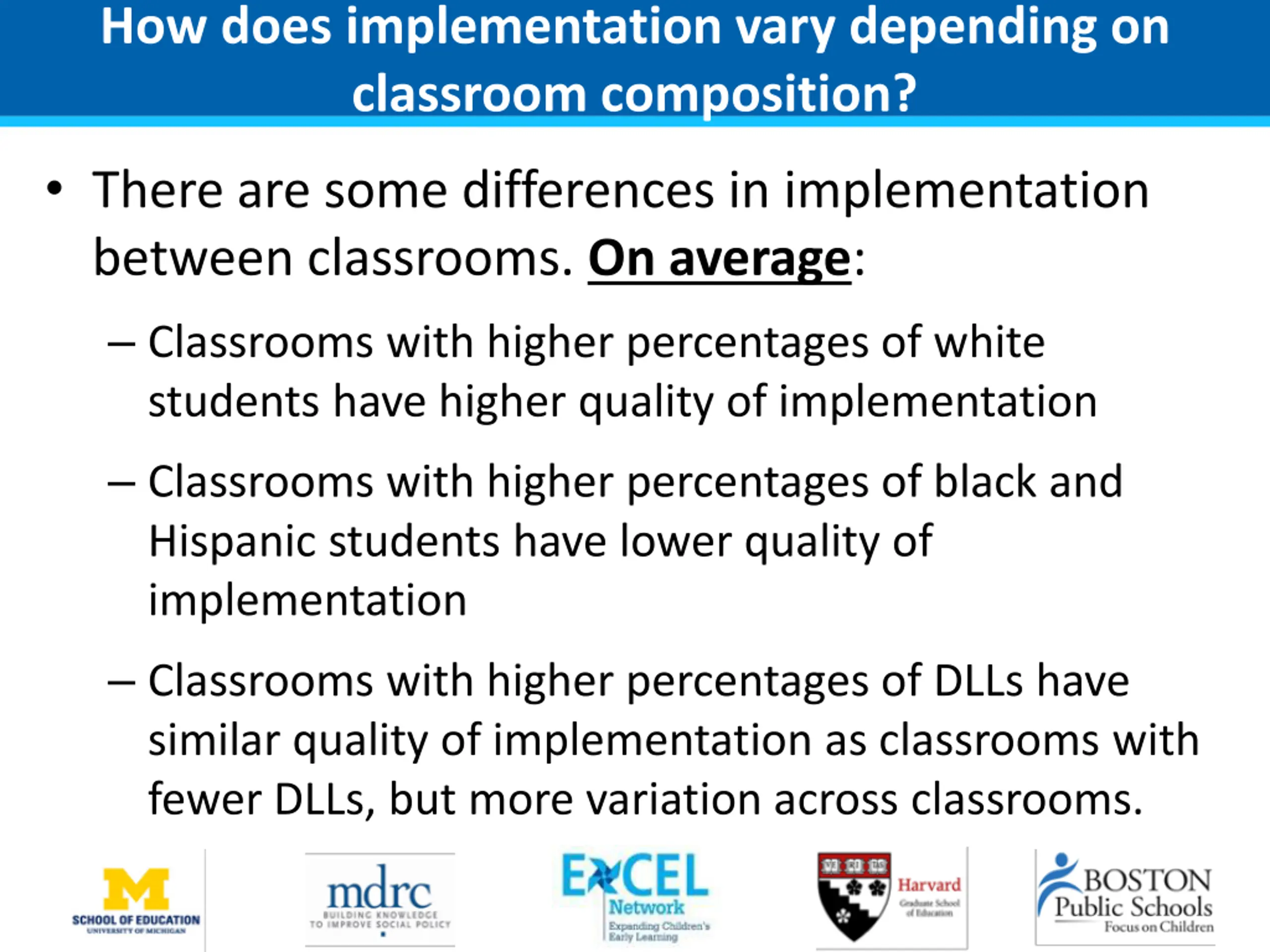 How does implementation vary depending on classroom composition? There are some differences in implementation between classrooms. On average: Classrooms with higher percentages of white students have higher quality of implementation Classrooms with higher percentages of black and Hispanic students have lower quality of implementation Classrooms with higher percentages of DLLs have similar quality of implementation as classrooms with fewer DLLs, but more variation across classrooms.