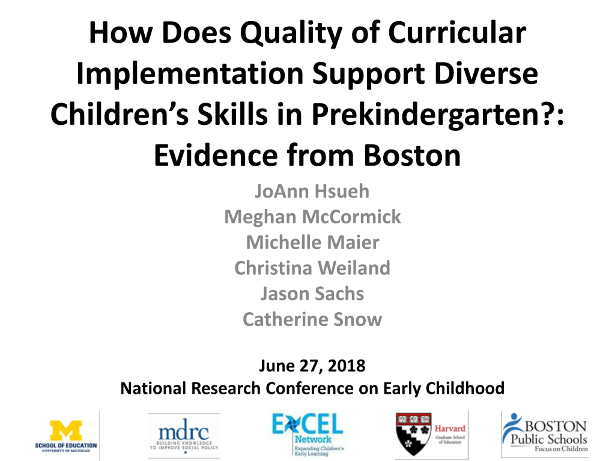 How Does Quality of Curricular Implementation Support Diverse Children s Skills in Prekindergarten?: Evidence from Boston JoAnn Hsueh Meghan McCormick Michelle Maier Christina Weiland Jason Sachs Catherine Snow June 27, 2018 National Research Conference on Early Childhood