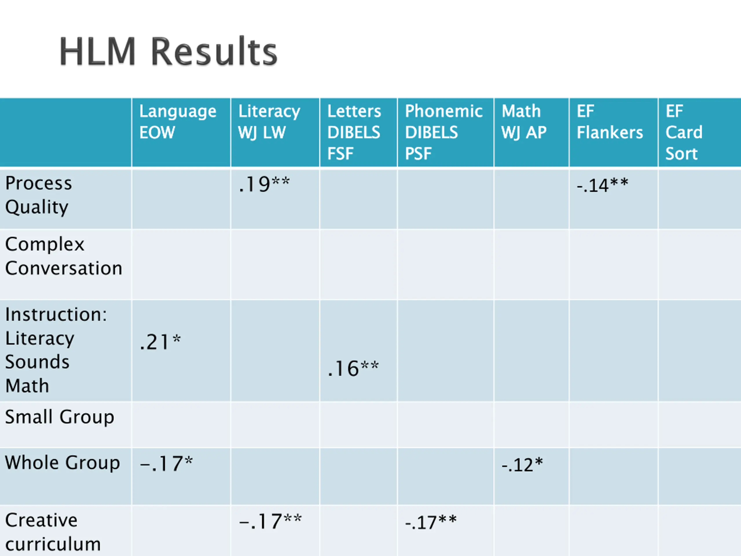Surprisingly sparse findings No one ECE dimension predicted all outcomes Best predictors Instructional time: positively related to gains in language and specific literacy skills Whole group: negatively related to gains in language and math Curriculum: negatively related to gains in literacy Process quality: mixed, positive gains-decoding, negative gains inhibitory control