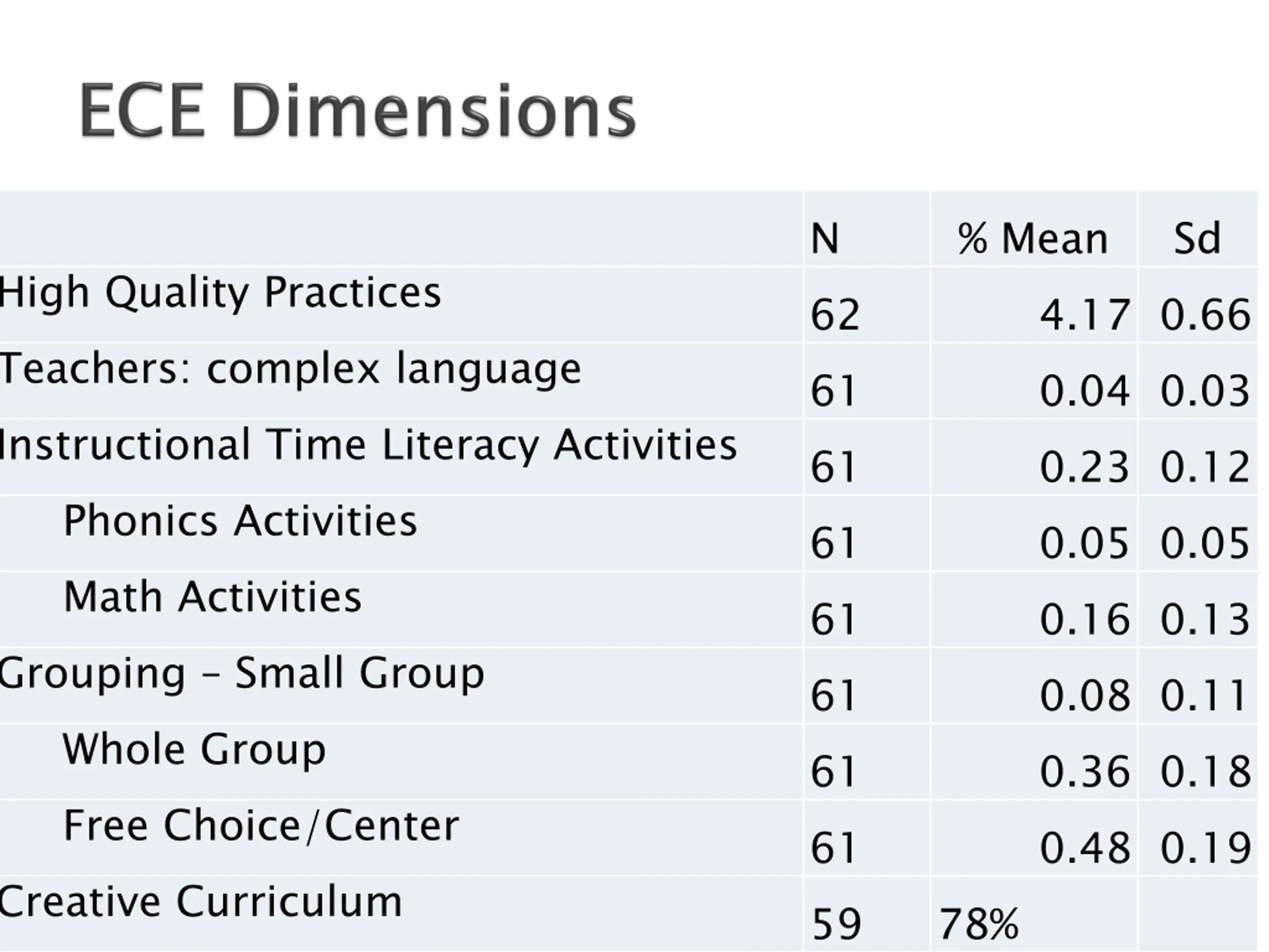 N 62 61 61 61 61 61 61 61 59 % Mean Sd High Quality Practices Teachers: complex language Instructional Time Literacy Activities Phonics Activities Math Activities Grouping Small Group Whole Group Free Choice/Center Creative Curriculum 4.17 0.66 0.04 0.03 0.23 0.12 0.05 0.05 0.16 0.13 0.08 0.11 0.36 0.18 0.48 0.19 78%