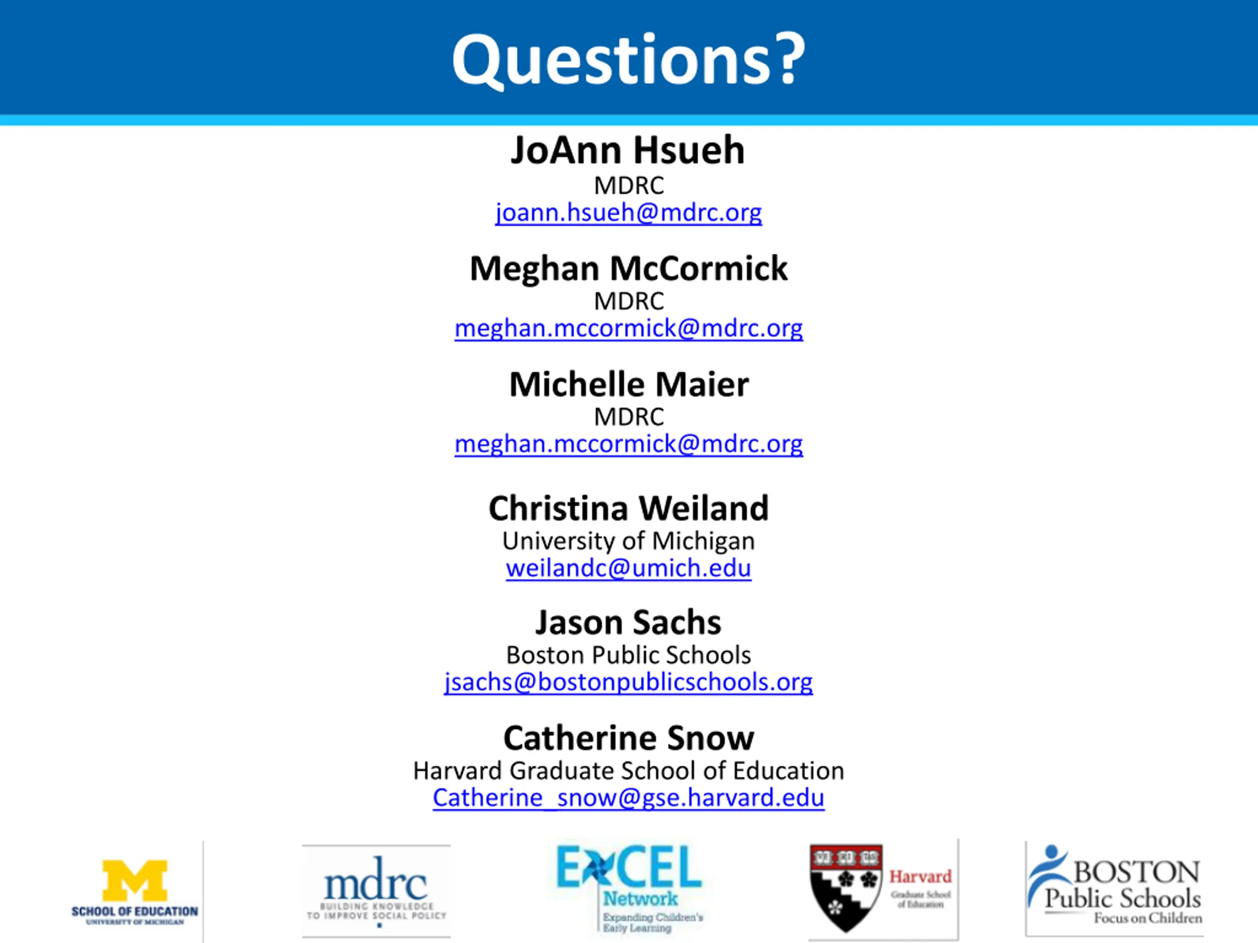 Questions? JoAnn Hsueh MDRC joann.hsueh@mdrc.org Meghan McCormick MDRC meghan.mccormick@mdrc.org Michelle Maier MDRC meghan.mccormick@mdrc.org Christina Weiland University of Michigan weilandc@umich.edu Jason Sachs Boston Public Schools jsachs@bostonpublicschools.org Catherine Snow Harvard Graduate School of Education Catherine_snow@gse.harvard.edu