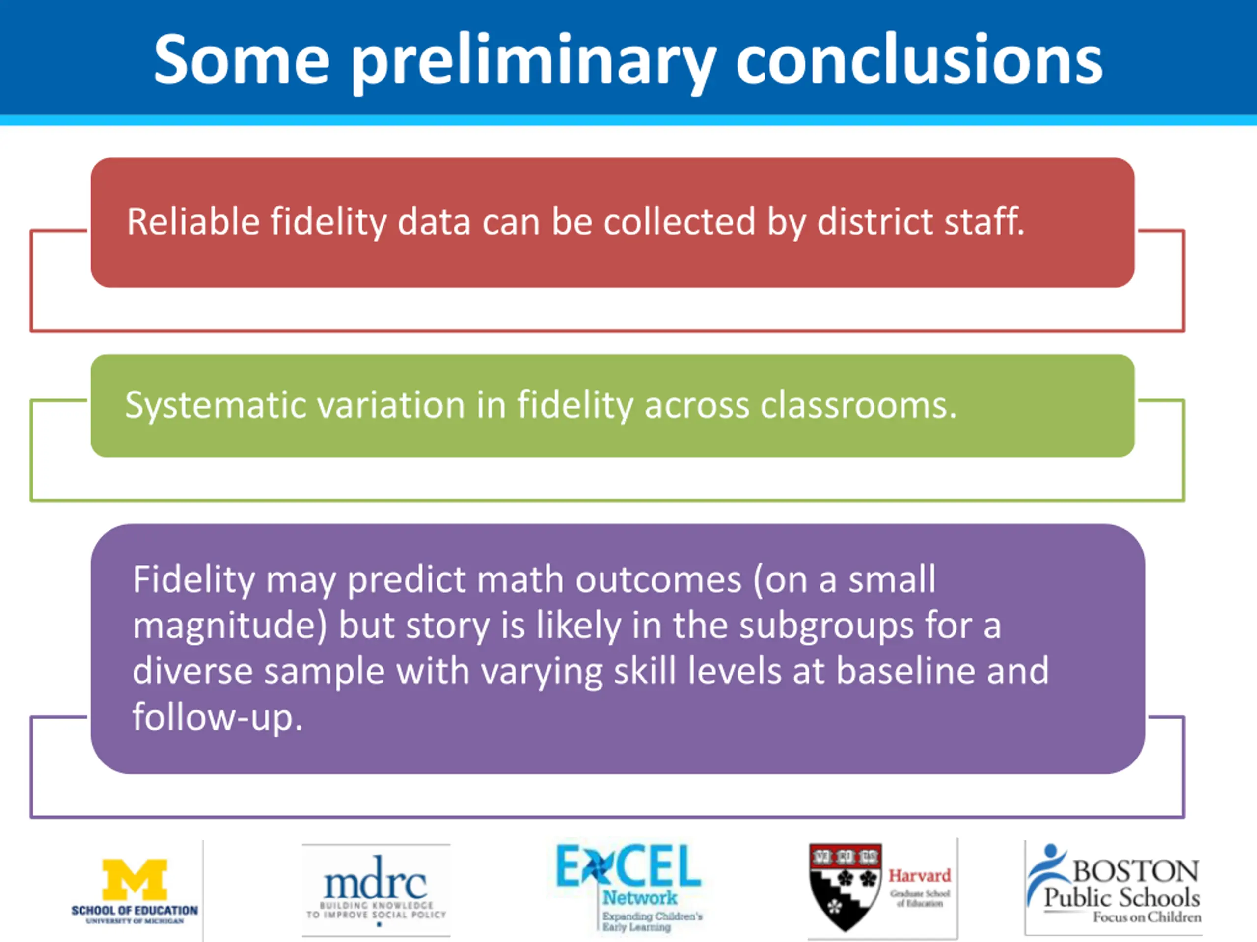 Some preliminary conclusions Reliable fidelity data can be collected by district staff. Systematic variation in fidelity across classrooms. Fidelity may predict math outcomes (on a small magnitude) but story is likely in the subgroups for a diverse sample with varying skill levels at baseline and follow-up.