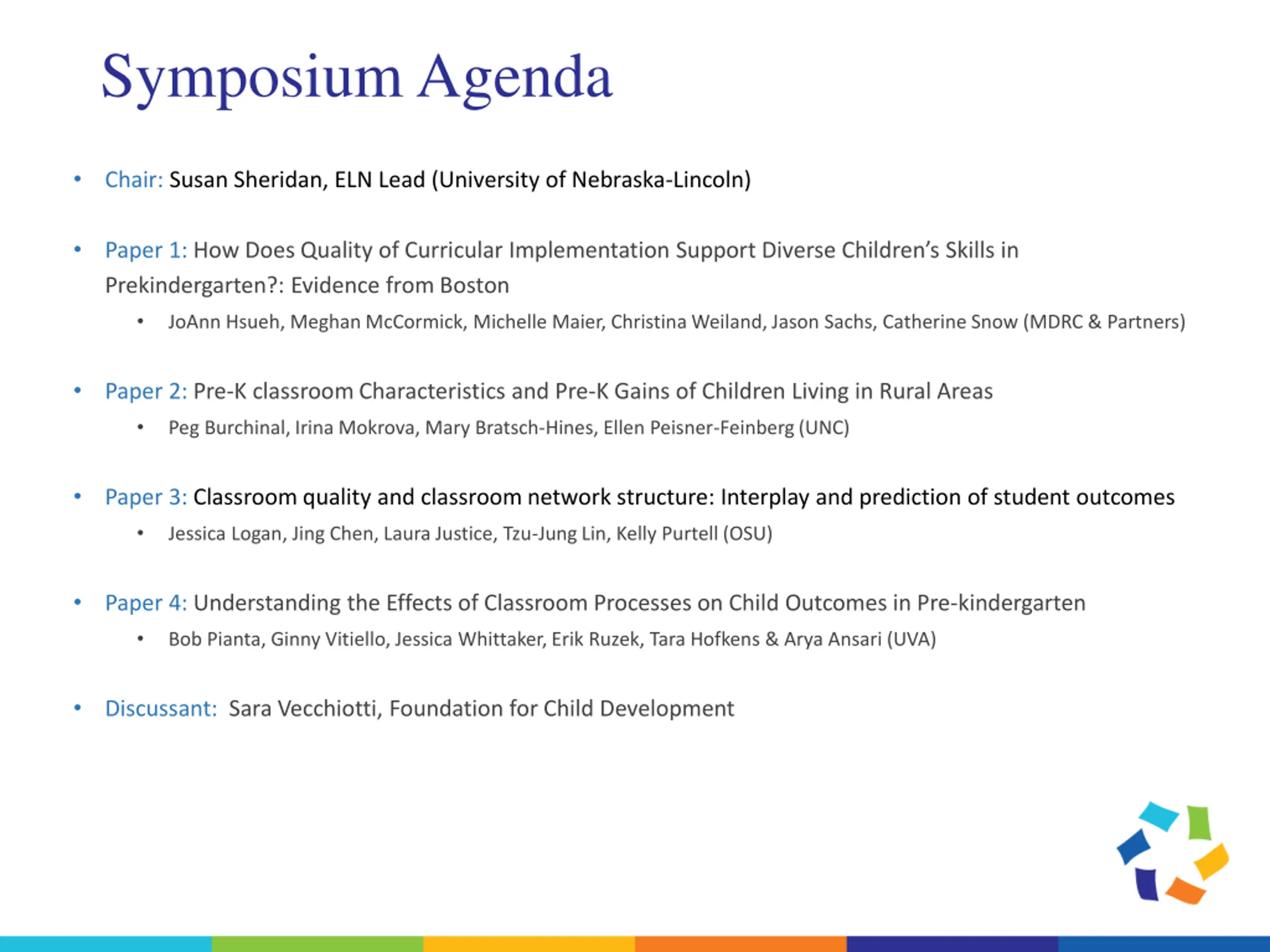 Symposium Agenda Chair: Susan Sheridan, ELN Lead (University of Nebraska-Lincoln) Paper 1: How Does Quality of Curricular Implementation Support Diverse Children s Skills in Prekindergarten?: Evidence from Boston JoAnn Hsueh, Meghan McCormick, Michelle Maier, Christina Weiland, Jason Sachs, Catherine Snow (MDRC & Partners) Paper 2: Pre-K classroom Characteristics and Pre-K Gains of Children Living in Rural Areas Peg Burchinal, Irina Mokrova, Mary Bratsch-Hines, Ellen Peisner-Feinberg (UNC) Paper 3: Classroom quality and classroom network structure: Interplay and prediction of student outcomes Jessica Logan, Jing Chen, Laura Justice, Tzu-Jung Lin, Kelly Purtell (OSU) Paper 4: Understanding the Effects of Classroom Processes on Child Outcomes in Pre-kindergarten Bob Pianta, Ginny Vitiello, Jessica Whittaker, Erik Ruzek, Tara Hofkens & Arya Ansari (UVA) Discussant: Sara Vecchiotti, Foundation for Child Development