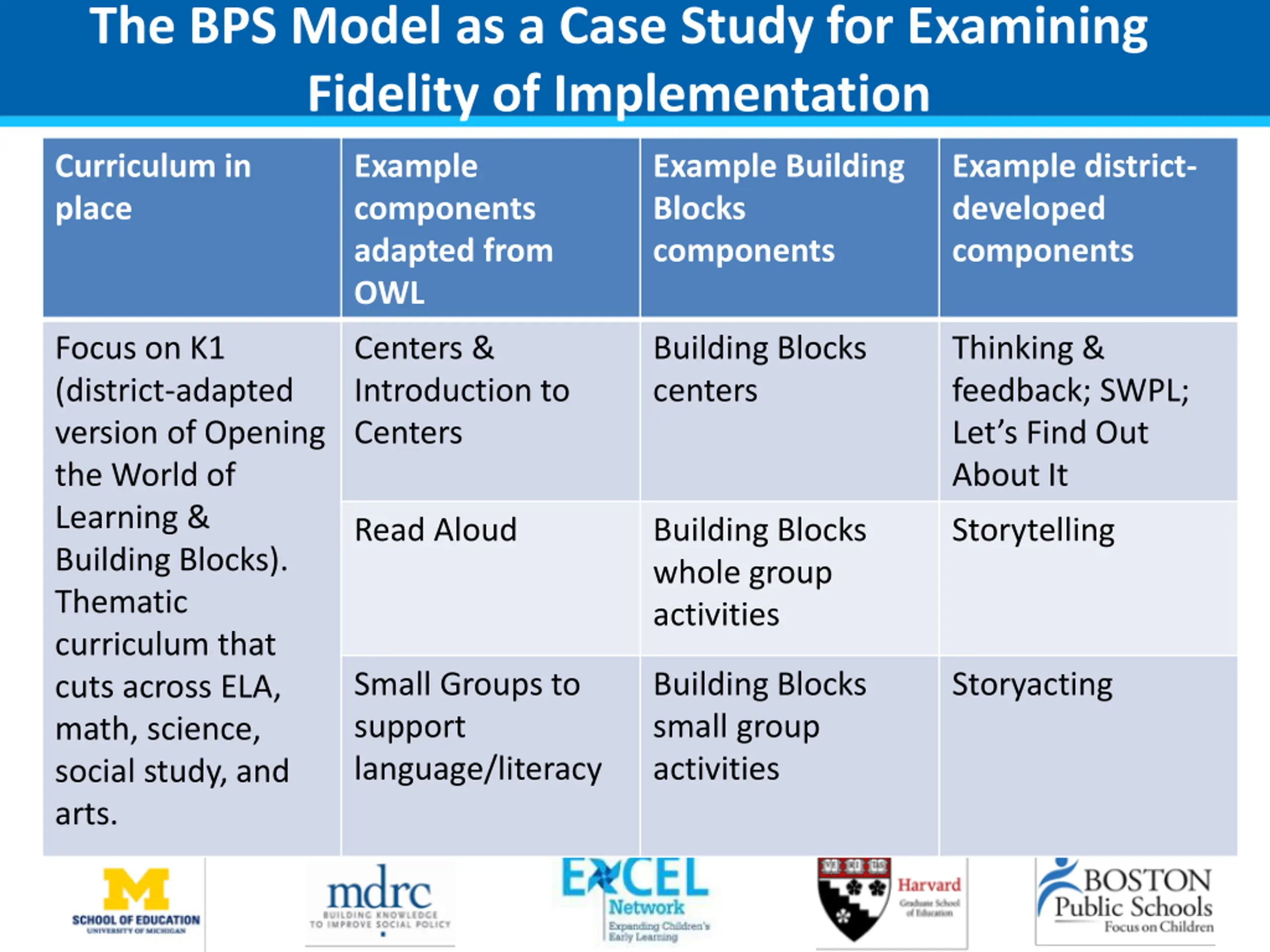 The BPS Model as a Case Study for Examining Fidelity of Implementation Curriculum in place Example components adapted from OWL Example Building Blocks components Example district- developed components Focus on K1 (district-adapted version of Opening the World of Learning & Building Blocks). Thematic curriculum that cuts across ELA, math, science, social study, and arts. Centers & Introduction to Centers Building Blocks centers Thinking & feedback; SWPL; Let s Find Out About It Read Aloud Building Blocks whole group activities Storytelling Small Groups to support language/literacy Building Blocks small group activities Storyacting