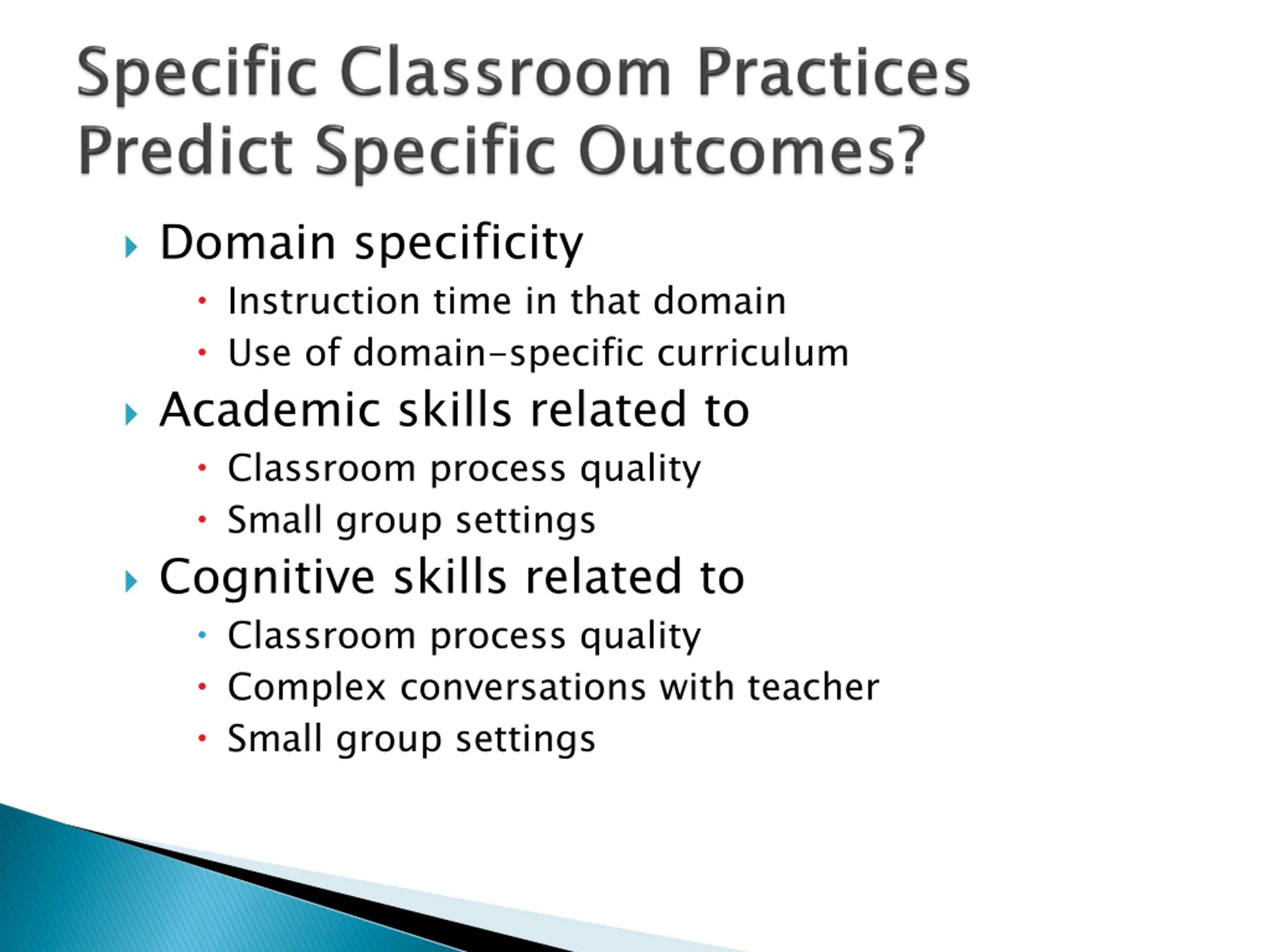 Domain specificity Instruction time in that domain Use of domain-specific curriculum Academic skills related to Classroom process quality Small group settings Cognitive skills related to Classroom process quality Complex conversations with teacher Small group settings