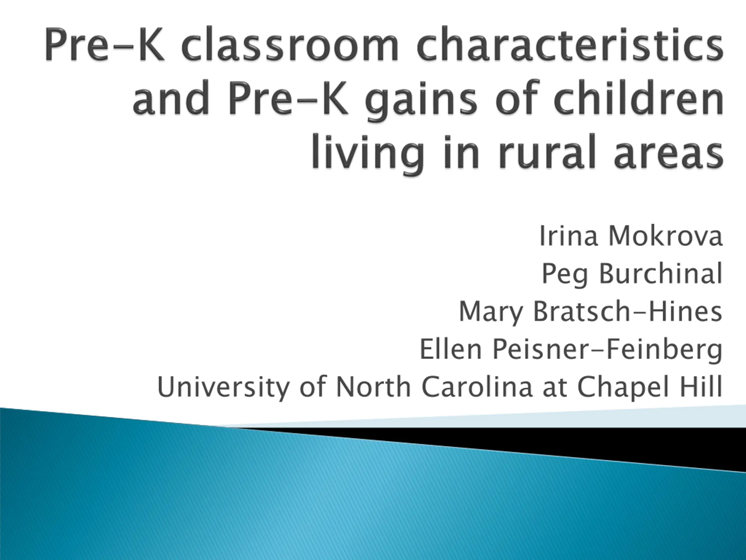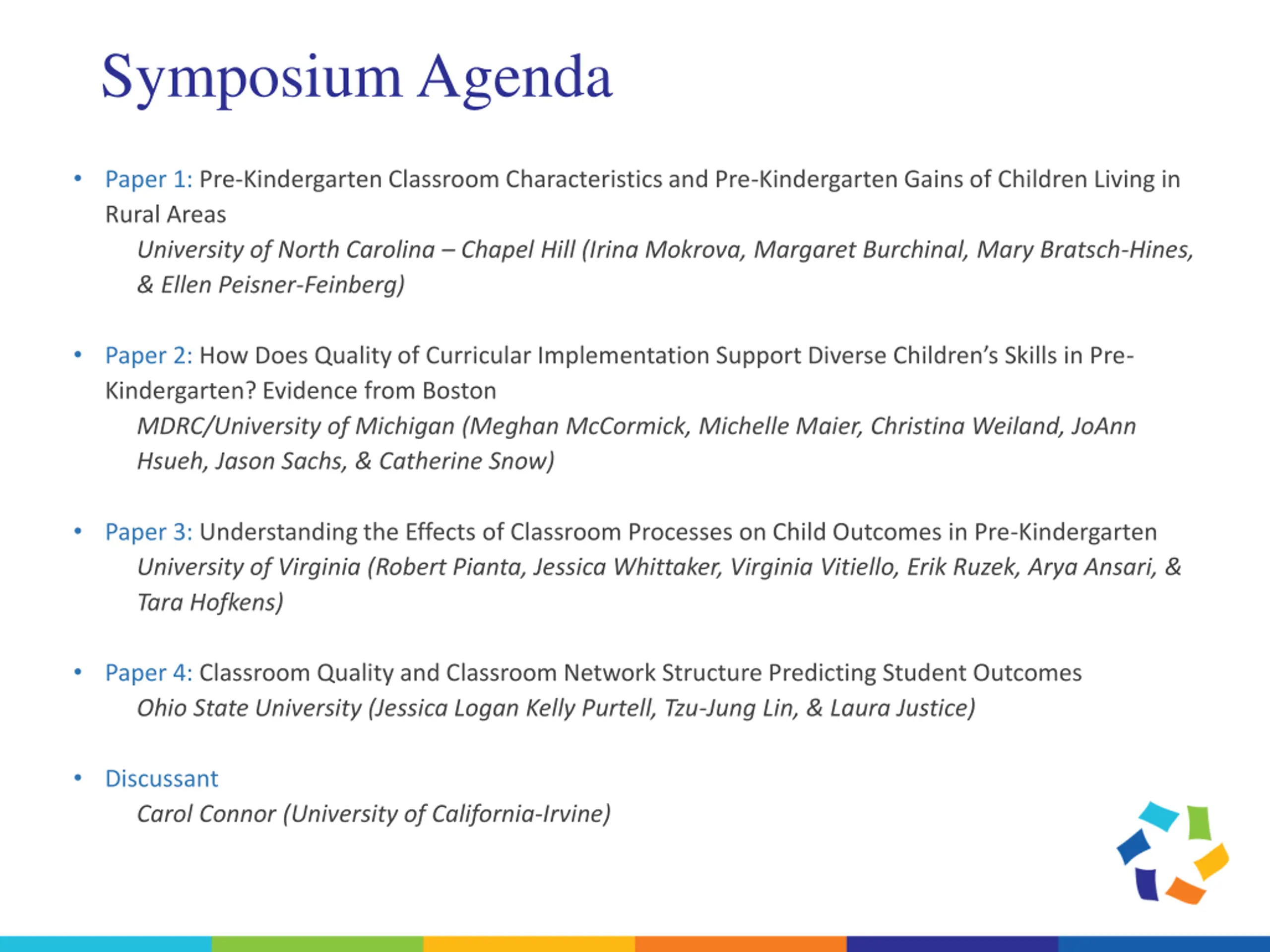 Symposium Agenda Paper 1: Pre-Kindergarten Classroom Characteristics and Pre-Kindergarten Gains of Children Living in Rural Areas University of North Carolina Chapel Hill (Irina Mokrova, Margaret Burchinal, Mary Bratsch-Hines, & Ellen Peisner-Feinberg) Paper 2: How Does Quality of Curricular Implementation Support Diverse Children s Skills in Pre- Kindergarten? Evidence from Boston MDRC/University of Michigan (Meghan McCormick, Michelle Maier, Christina Weiland, JoAnn Hsueh, Jason Sachs, & Catherine Snow) Paper 3: Understanding the Effects of Classroom Processes on Child Outcomes in Pre-Kindergarten University of Virginia (Robert Pianta, Jessica Whittaker, Virginia Vitiello, Erik Ruzek, Arya Ansari, & Tara Hofkens) Paper 4: Classroom Quality and Classroom Network Structure Predicting Student Outcomes Ohio State University (Jessica Logan Kelly Purtell, Tzu-Jung Lin, & Laura Justice) Discussant Carol Connor (University of California-Irvine)
