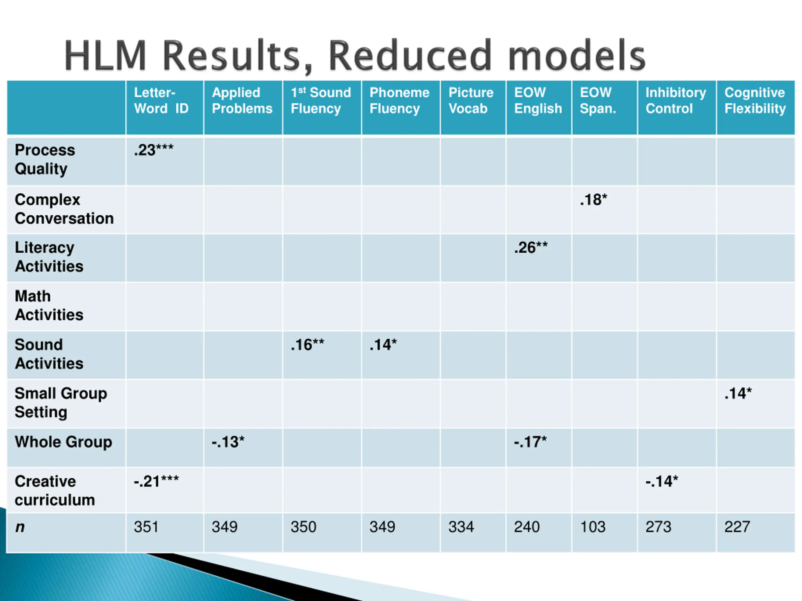 Letter- Word ID Applied Problems 1st Sound Fluency Phoneme Fluency Picture Vocab EOW English EOW Span. Inhibitory Control Cognitive Flexibility Process Quality .23*** Complex Conversation .18* Literacy Activities .26** Math Activities Sound Activities .16** .14* Small Group Setting .14* Whole Group -.13* -.17* Creative curriculum -.21*** -.14* n 351 349 350 349 334 240 103 273 227
