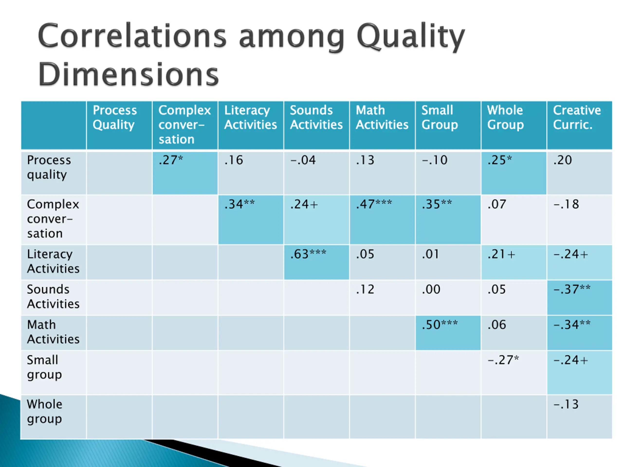Process Quality Process Quality Complex conver sation .27* Complex conver- - sation Literacy Activities Literacy Activities Sounds Activities Sounds Activities Math Activities Math Activities Small Group Small Group Whole Group Whole Group Creative Curric Creative Curric. . Process quality .16 -.04 .13 -.10 .25* .20 Complex conver- sation Literacy Activities Sounds Activities Math Activities Small group .34** .24+ .47*** .35** .07 -.18 .63*** .05 .01 .21+ -.24+ .12 .00 .05 -.37** .50*** .06 -.34** -.27* -.24+ Whole group -.13