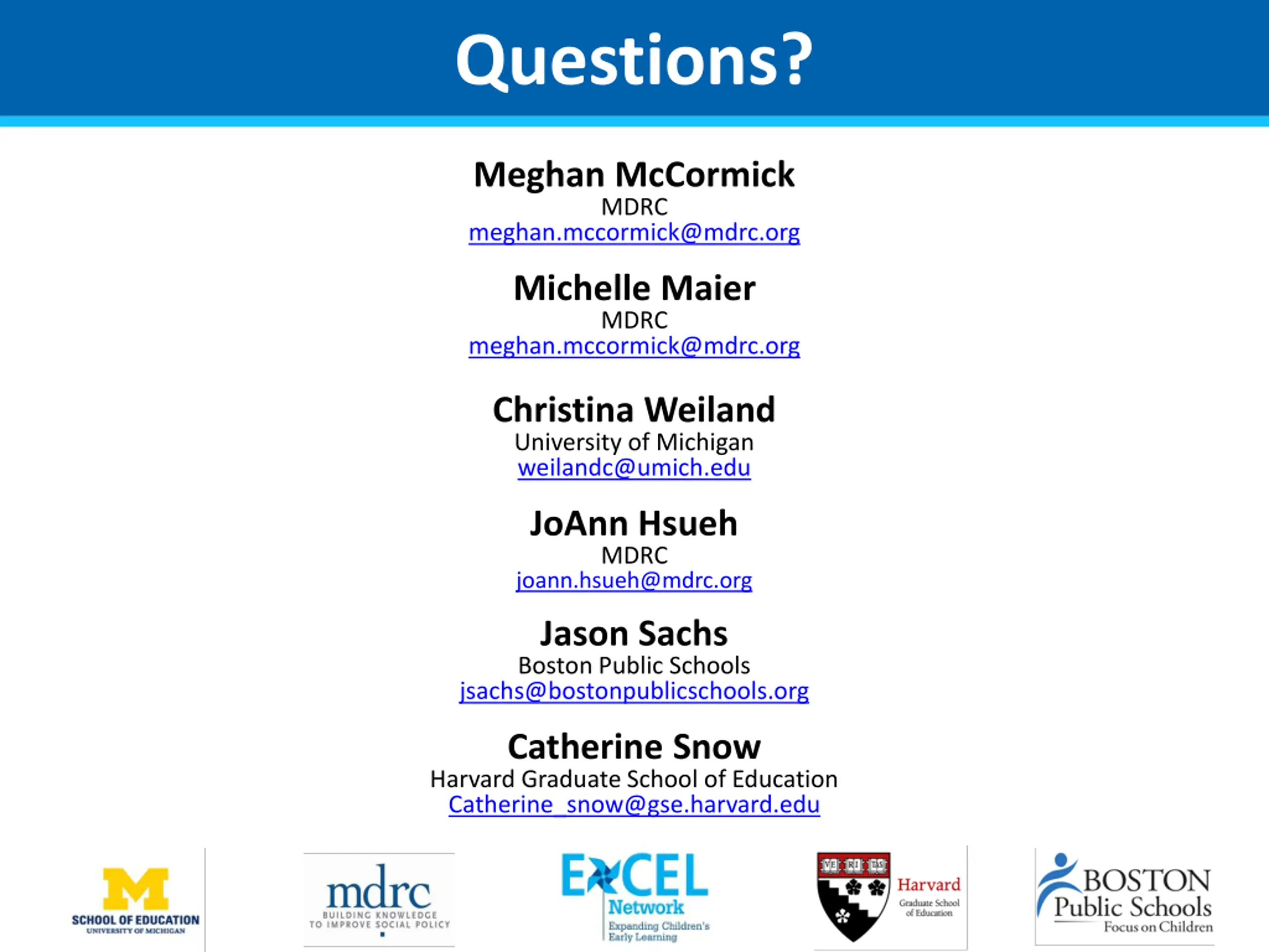 Questions? Meghan McCormick MDRC meghan.mccormick@mdrc.org Michelle Maier MDRC meghan.mccormick@mdrc.org Christina Weiland University of Michigan weilandc@umich.edu JoAnn Hsueh MDRC joann.hsueh@mdrc.org Jason Sachs Boston Public Schools jsachs@bostonpublicschools.org Catherine Snow Harvard Graduate School of Education Catherine_snow@gse.harvard.edu