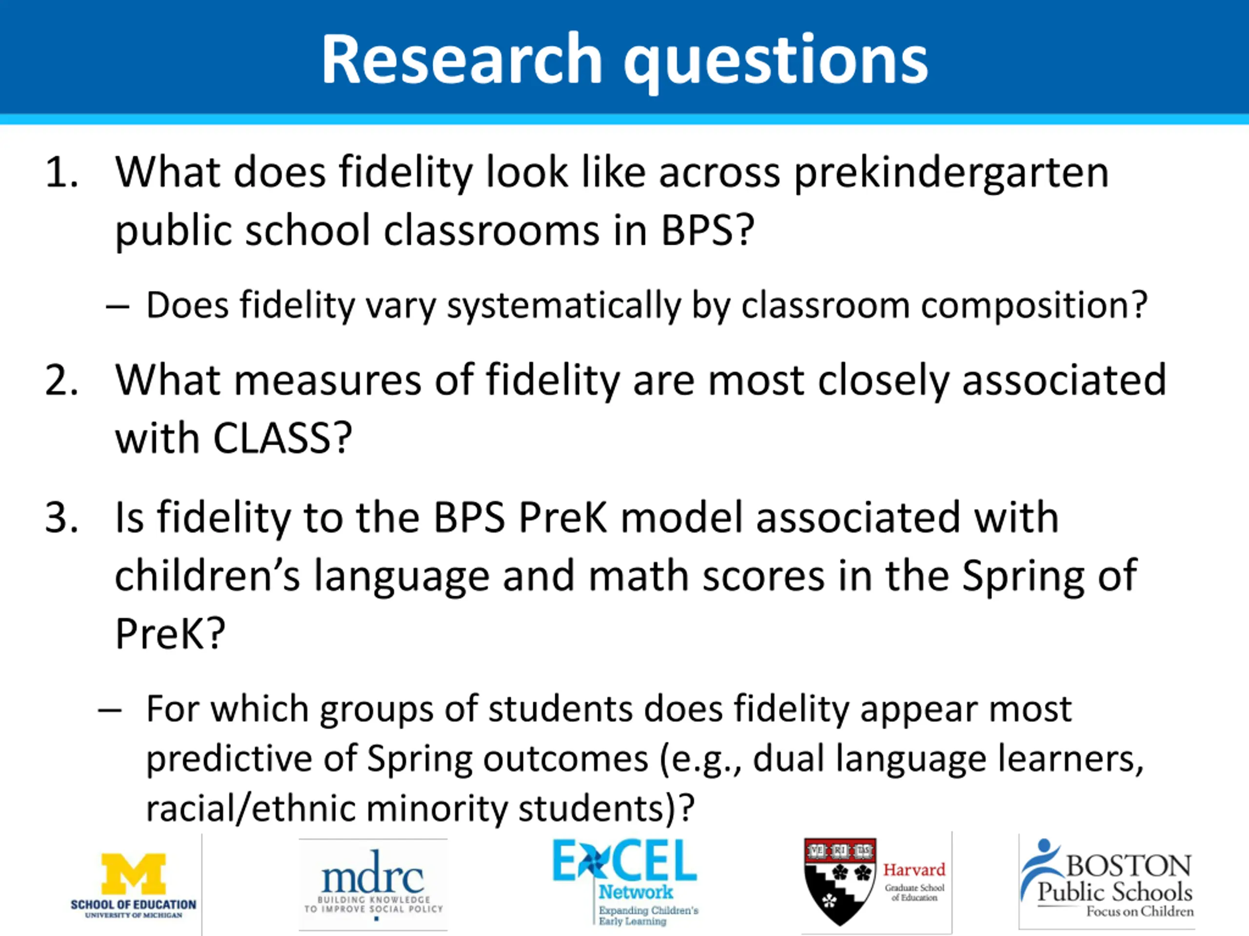 Research questions 1. What does fidelity look like across prekindergarten public school classrooms in BPS? Does fidelity vary systematically by classroom composition? 2. What measures of fidelity are most closely associated with CLASS? 3. Is fidelity to the BPS PreK model associated with children s language and math scores in the Spring of PreK? For which groups of students does fidelity appear most predictive of Spring outcomes (e.g., dual language learners, racial/ethnic minority students)?