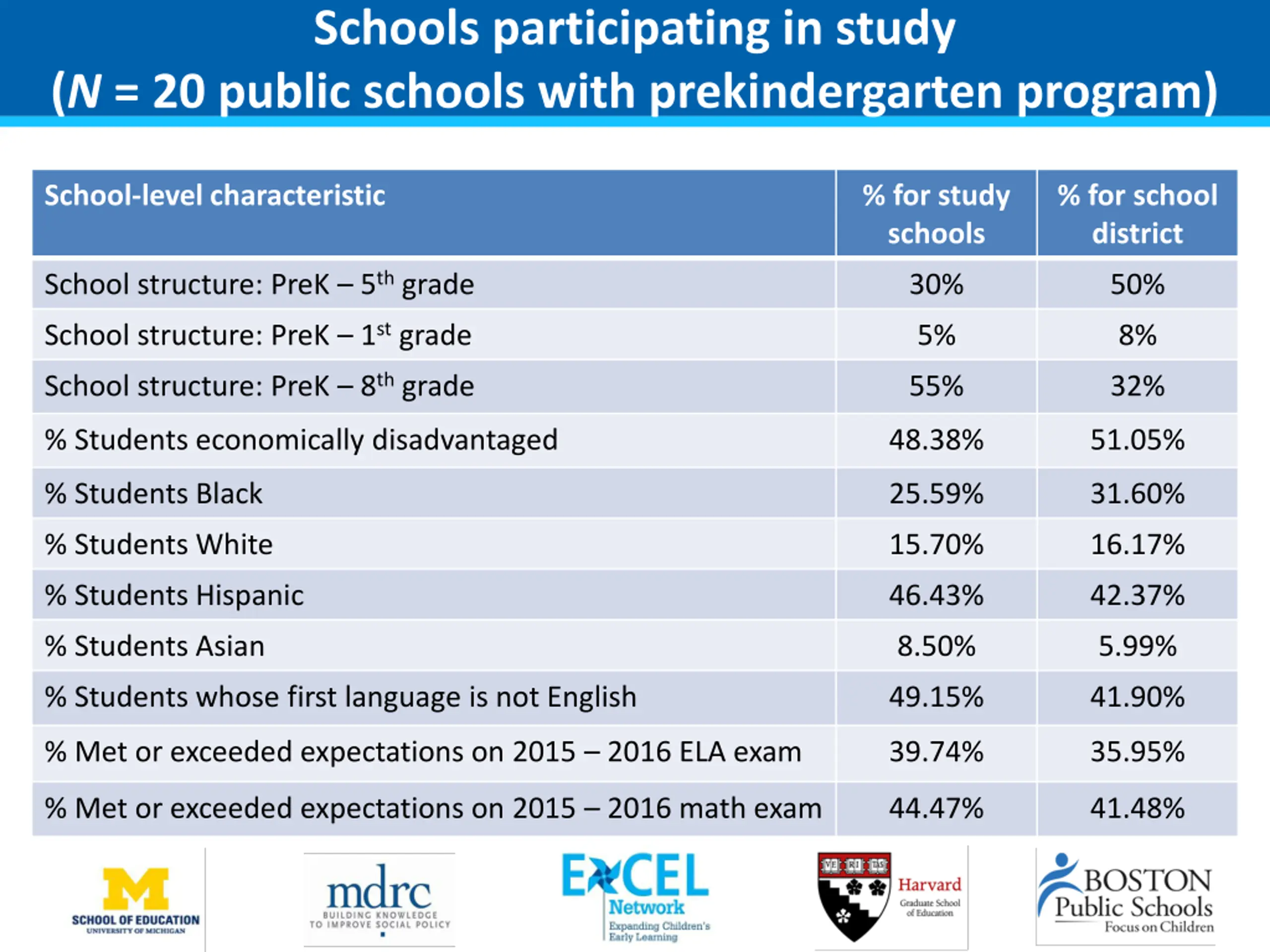 Schools participating in study (N = 20 public schools with prekindergarten program) School-level characteristic % for study schools % for school district School structure: PreK 5th grade 30% 50% School structure: PreK 1st grade 5% 8% School structure: PreK 8th grade 55% 32% % Students economically disadvantaged 48.38% 51.05% % Students Black 25.59% 31.60% % Students White 15.70% 16.17% % Students Hispanic 46.43% 42.37% % Students Asian 8.50% 5.99% % Students whose first language is not English 49.15% 41.90% % Met or exceeded expectations on 2015 2016 ELA exam 39.74% 35.95% % Met or exceeded expectations on 2015 2016 math exam 44.47% 41.48%