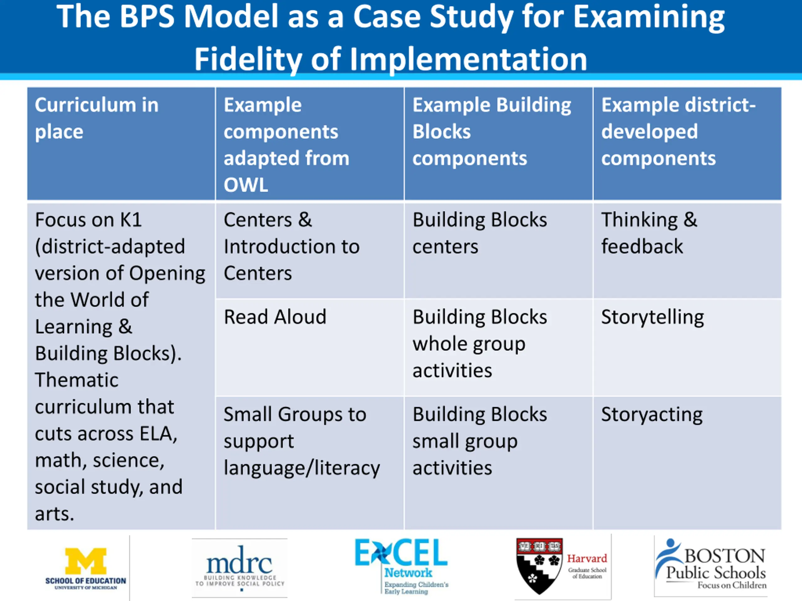 The BPS Model as a Case Study for Examining Fidelity of Implementation Curriculum in place Example components adapted from OWL Example Building Blocks components Example district- developed components Focus on K1 (district-adapted version of Opening the World of Learning & Building Blocks). Thematic curriculum that cuts across ELA, math, science, social study, and arts. Centers & Introduction to Centers Building Blocks centers Thinking & feedback Read Aloud Building Blocks whole group activities Storytelling Small Groups to support language/literacy Building Blocks small group activities Storyacting