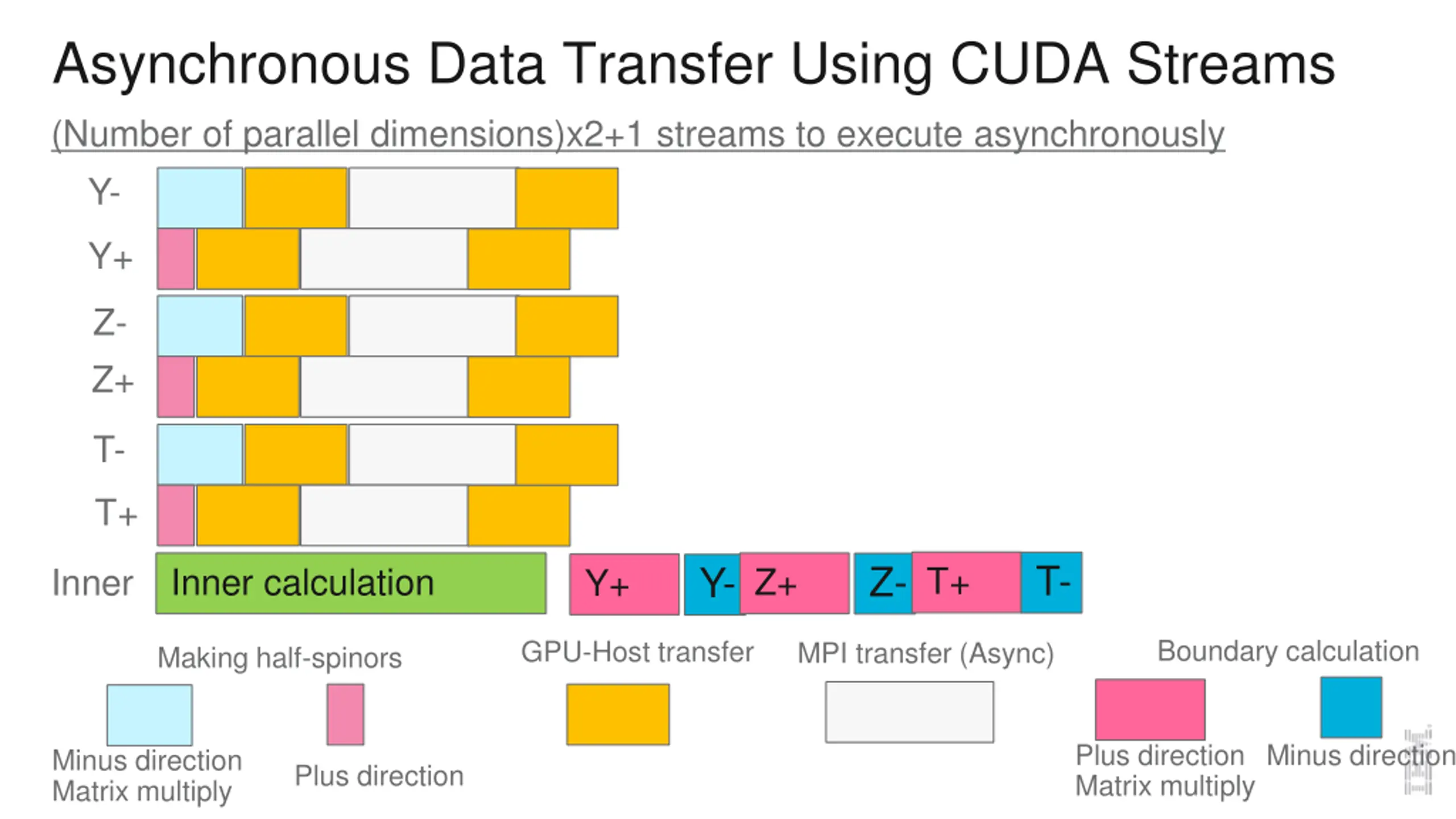 Asynchronous Data Transfer Using CUDA Streams (Number of parallel dimensions)x2+1 streams to execute asynchronously Y- Y+ Z- Z+ T- T+ T- Z- T+ Y- Inner calculation Z+ Inner Y+ Boundary calculation GPU-Host transfer MPI transfer (Async) Making half-spinors Plus direction Matrix multiply Minus direction Minus direction Matrix multiply Plus direction