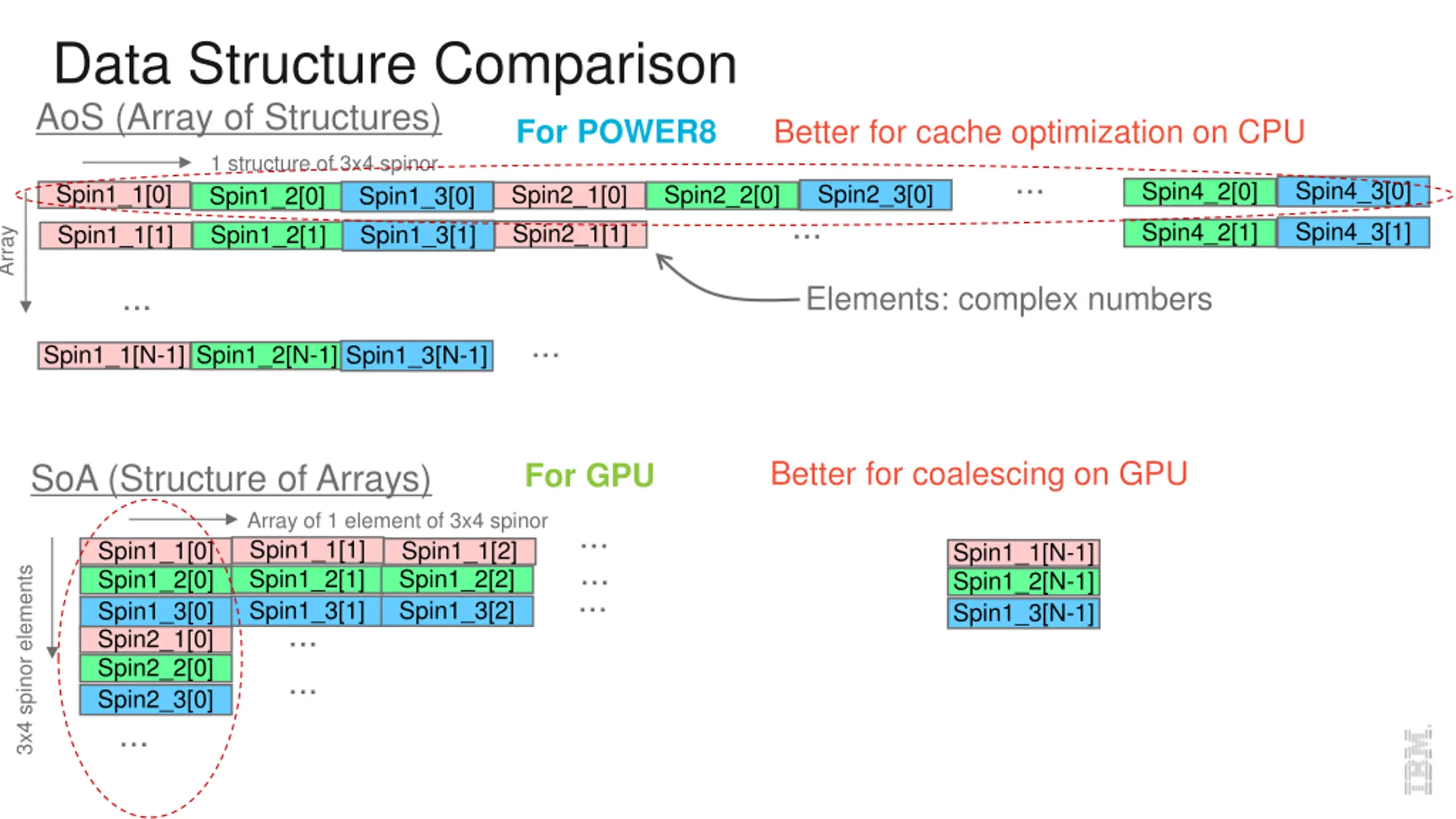 Data Structure Comparison AoS (Array of Structures) Better for cache optimization on CPU For POWER8 1 structure of 3x4 spinor ... Spin4_3[0] Spin4_2[0] Spin1_1[0] Spin2_3[0] ... Spin2_1[0] Spin2_1[1] Spin2_2[0] Spin1_2[0] Spin1_2[1] Spin1_3[0] Spin1_3[1] Spin4_3[1] Spin4_2[1] Spin1_1[1] Array ... Elements: complex numbers ... Spin1_1[N-1] Spin1_2[N-1] Spin1_3[N-1] Better for coalescing on GPU SoA (Structure of Arrays) For GPU Array of 1 element of 3x4 spinor ... ... ... Spin1_1[1] Spin1_2[1] Spin1_1[0] Spin1_2[0] Spin1_1[2] Spin1_2[2] Spin1_1[N-1] Spin1_2[N-1] 3x4 spinor elements Spin1_3[1] ... ... Spin1_3[2] Spin1_3[0] Spin2_1[0] Spin2_2[0] Spin1_3[N-1] Spin2_3[0] ...