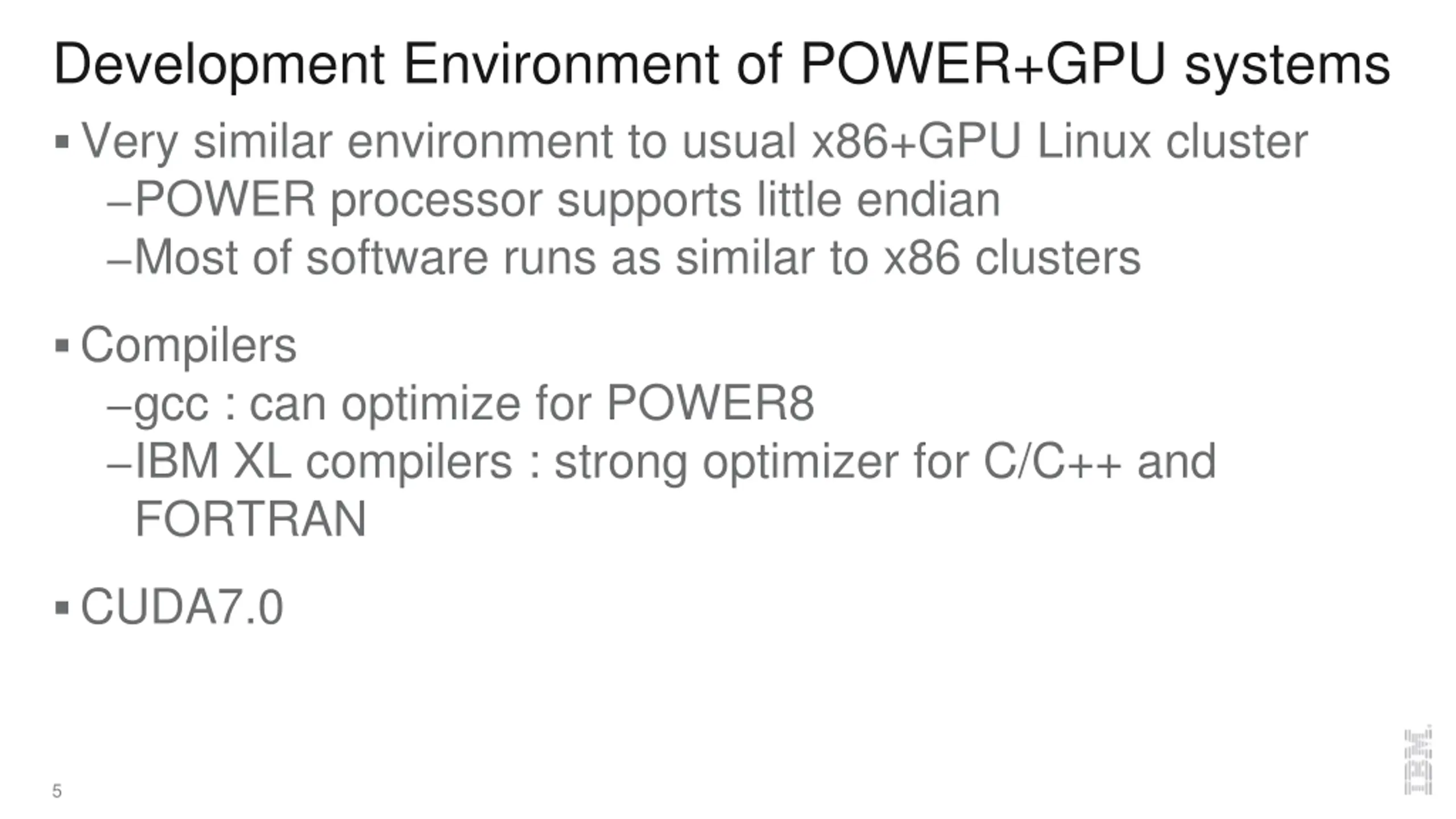 Development Environment of POWER+GPU systems Very similar environment to usual x86+GPU Linux cluster POWER processor supports little endian Most of software runs as similar to x86 clusters Compilers gcc : can optimize for POWER8 IBM XL compilers : strong optimizer for C/C++ and FORTRAN CUDA7.0 5