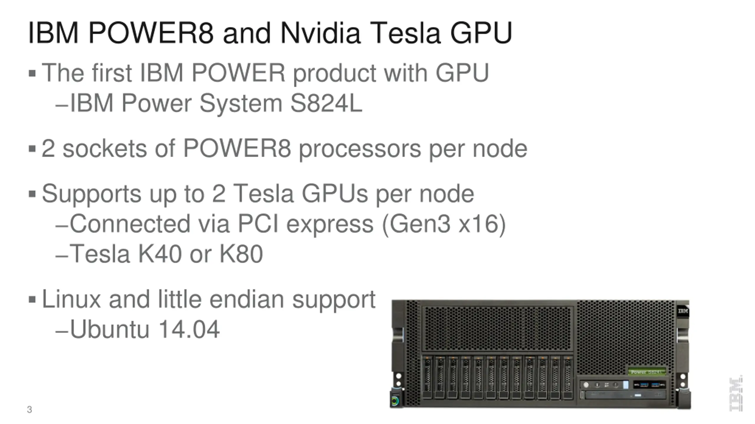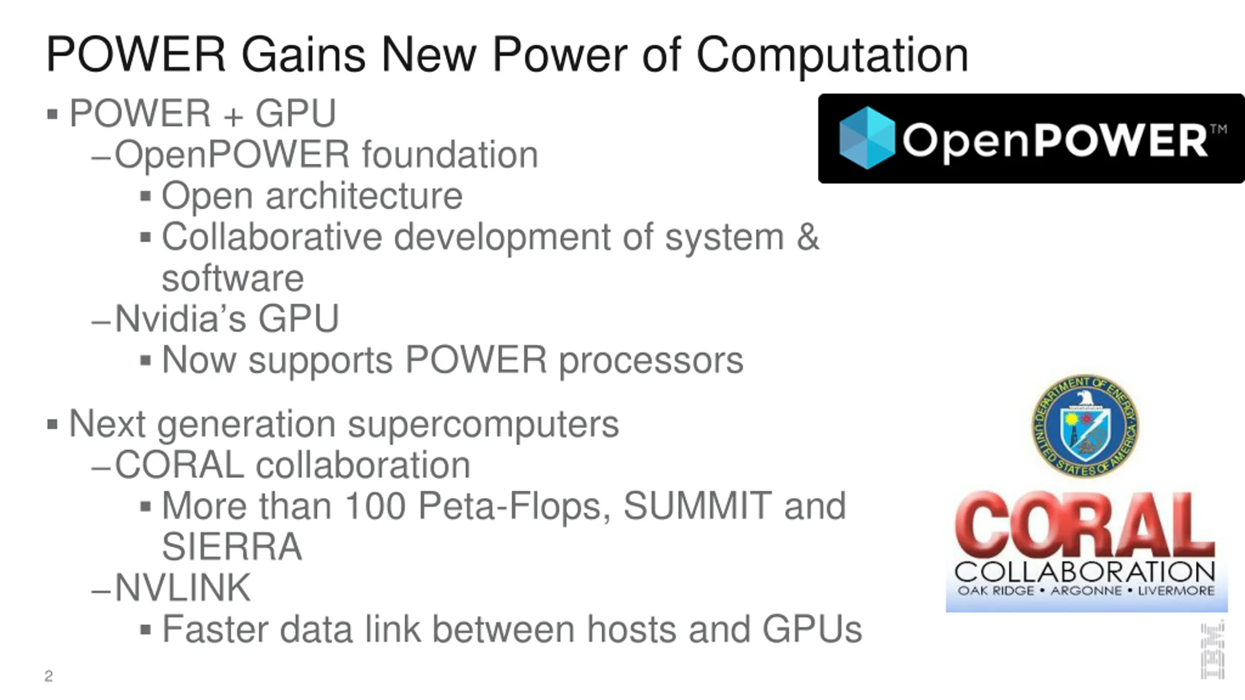POWER Gains New Power of Computation POWER + GPU OpenPOWER foundation Open architecture Collaborative development of system & software Nvidia s GPU Now supports POWER processors Next generation supercomputers CORAL collaboration More than 100 Peta-Flops, SUMMIT and SIERRA NVLINK Faster data link between hosts and GPUs 2