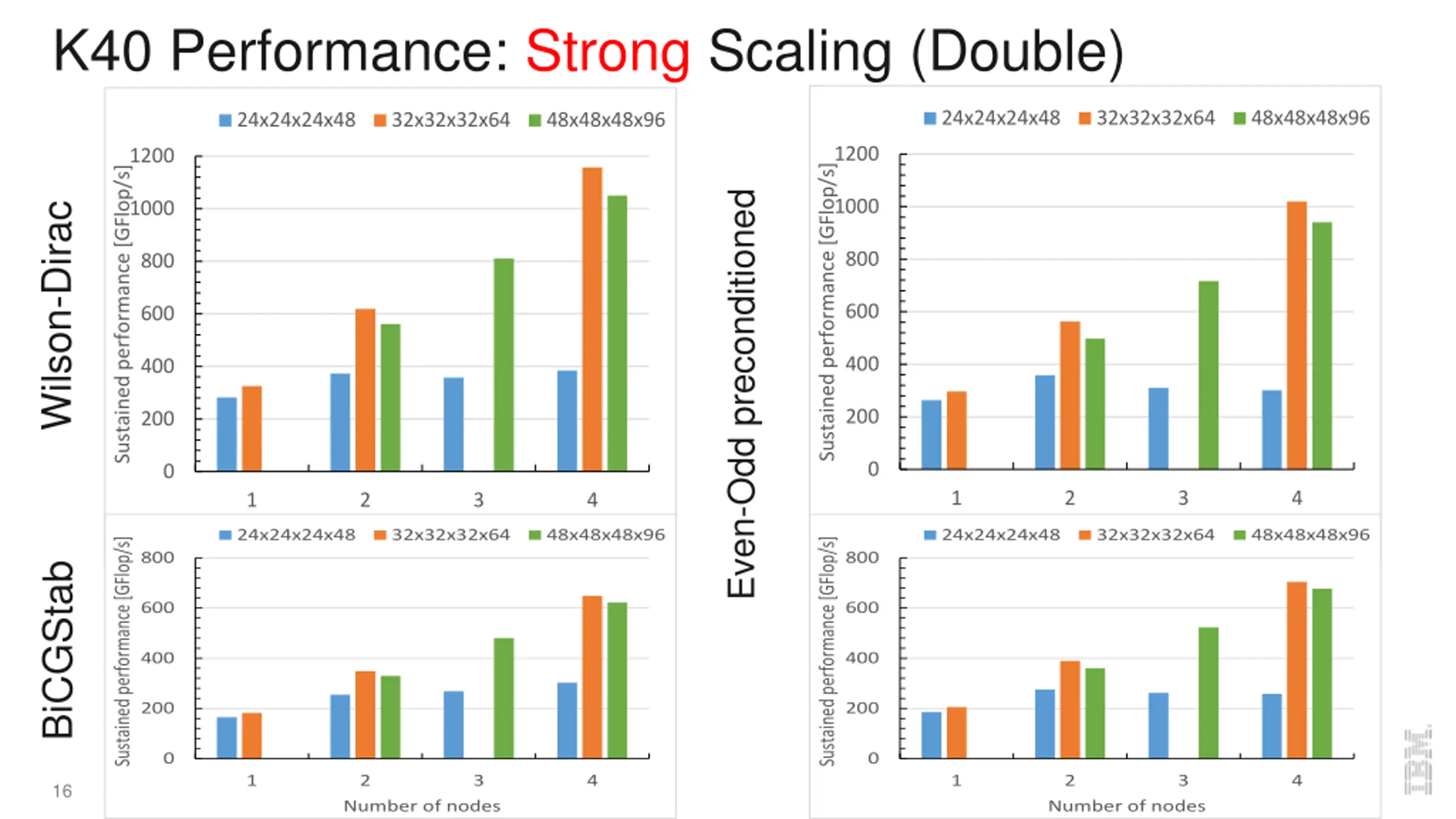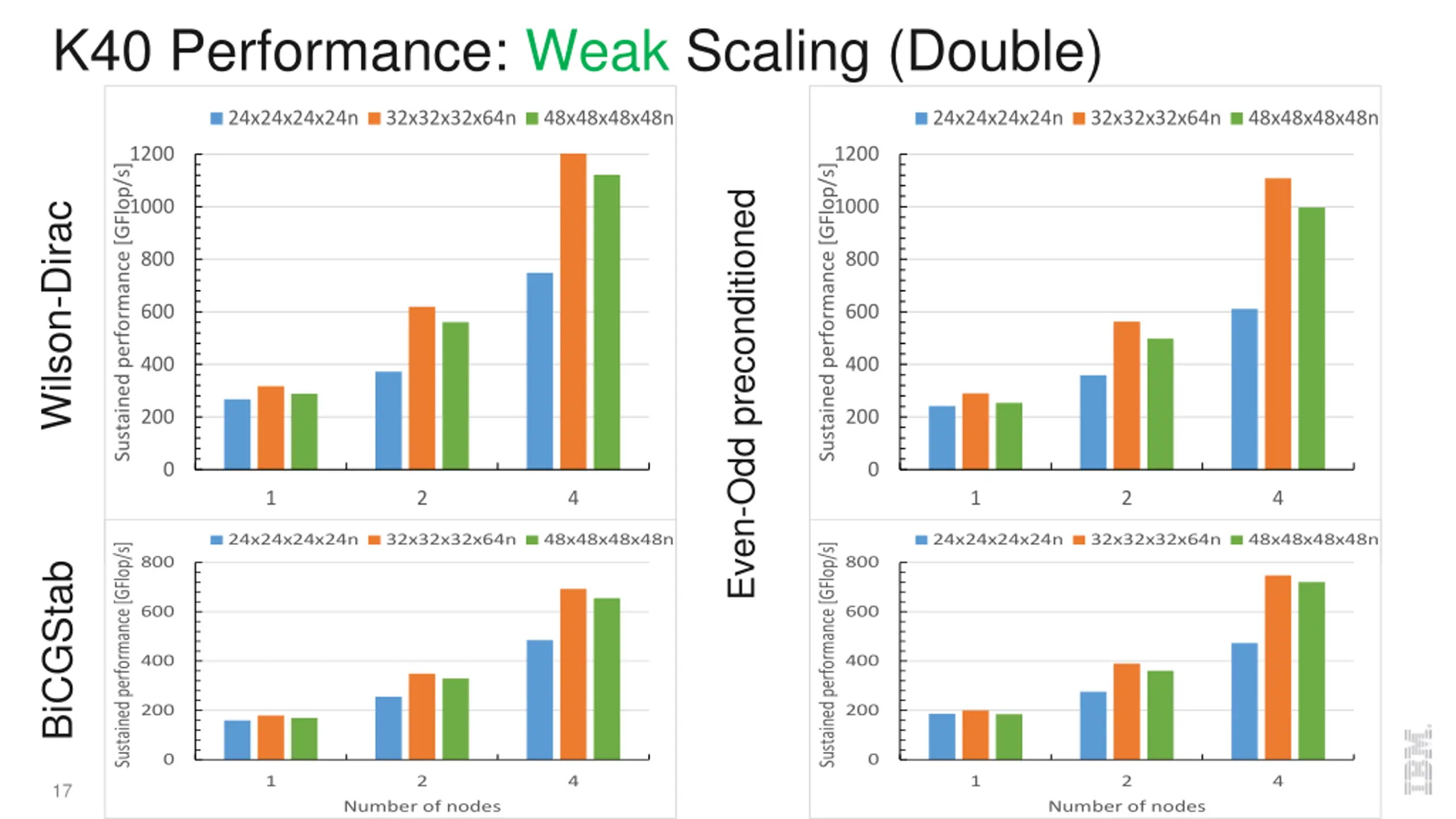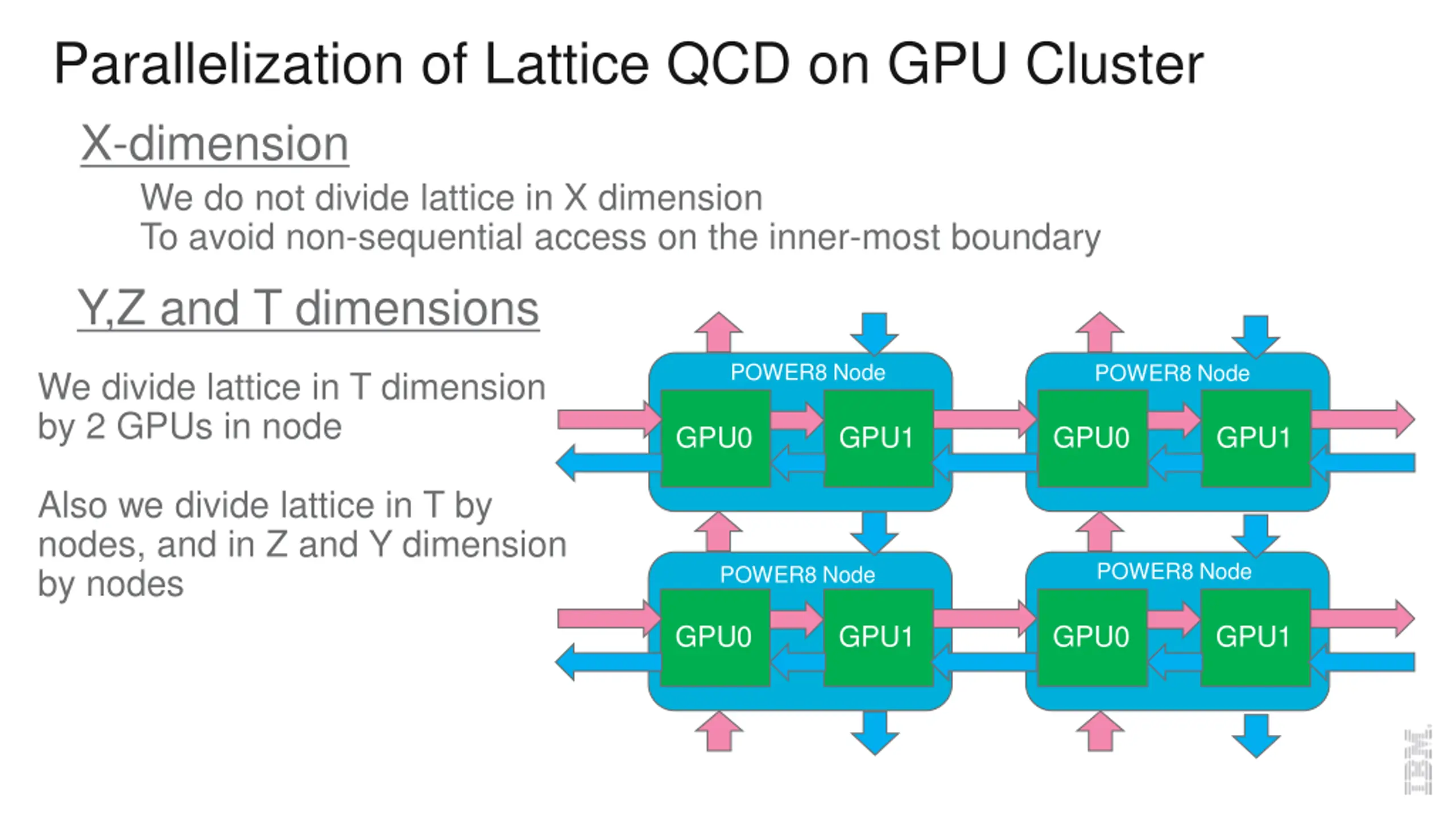 Parallelization of Lattice QCD on GPU Cluster X-dimension We do not divide lattice in X dimension To avoid non-sequential access on the inner-most boundary Y,Z and T dimensions POWER8 Node POWER8 Node We divide lattice in T dimension by 2 GPUs in node GPU0 GPU1 GPU0 GPU1 Also we divide lattice in T by nodes, and in Z and Y dimension by nodes POWER8 Node POWER8 Node GPU0 GPU1 GPU0 GPU1