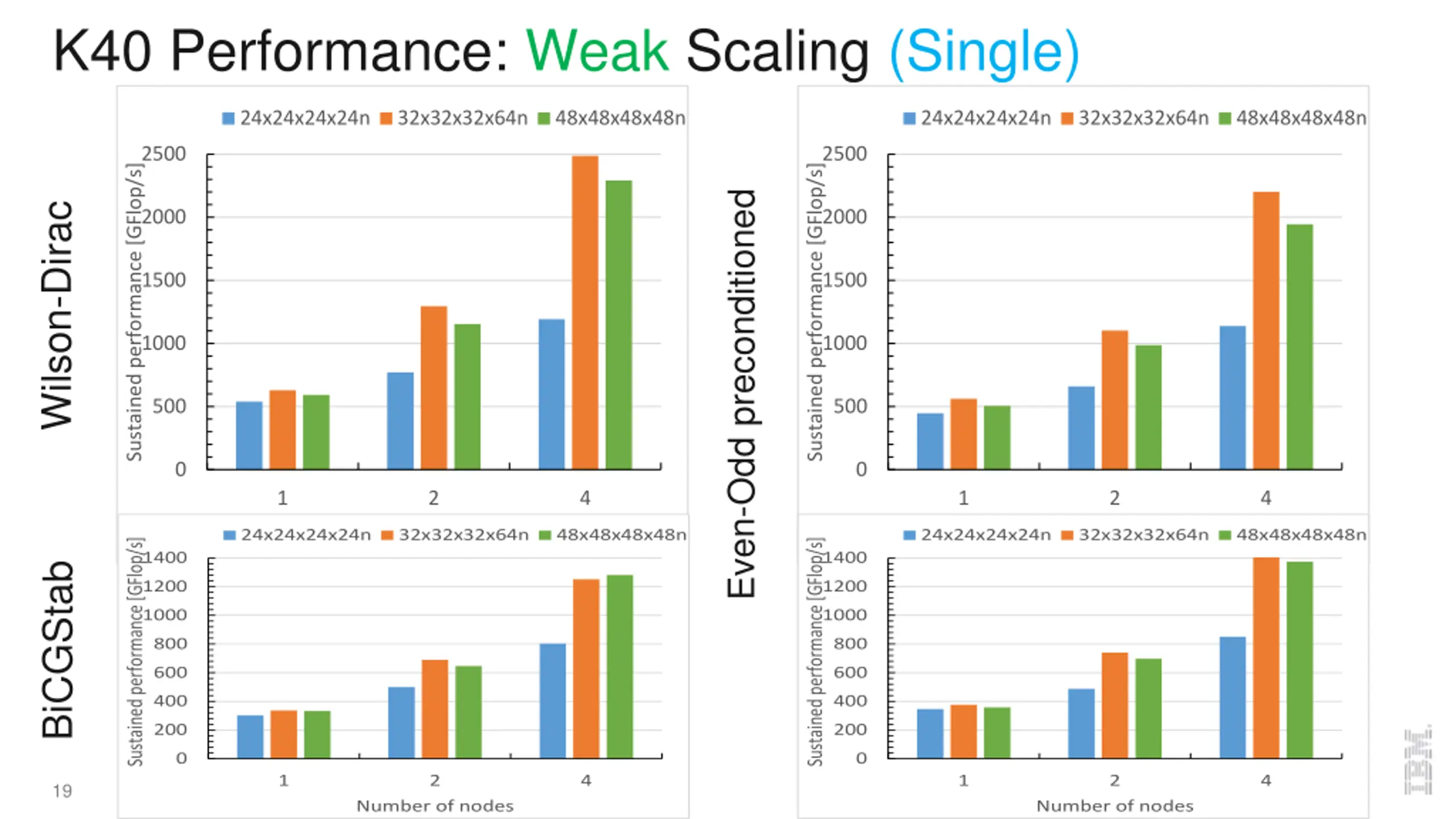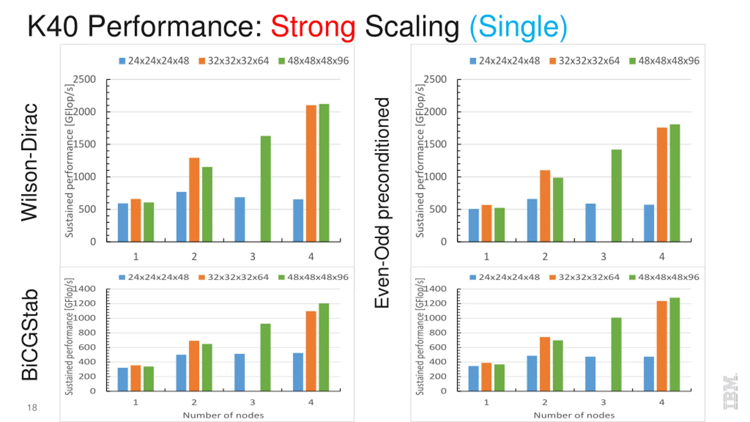 K40 Performance: Strong Scaling (Single) 24x24x24x48 32x32x32x64 48x48x48x96 24x24x24x48 32x32x32x64 48x48x48x96 2500 Sustained performance [GFlop/s] 2500 Sustained performance [GFlop/s] Even-Odd preconditioned Wilson-Dirac 2000 2000 1500 1500 1000 1000 500 500 0 0 1 2 3 4 1 2 3 4 Number of nodes 32x32x32x64 Number of nodes 32x32x32x64 24x24x24x48 48x48x48x96 24x24x24x48 48x48x48x96 Sustained performance [GFlop/s] Sustained performance [GFlop/s] 1400 1400 BiCGStab 1200 1200 1000 1000 800 800 600 600 400 400 200 200 0 0 1 2 3 4 1 2 3 4 18 Number of nodes Number of nodes