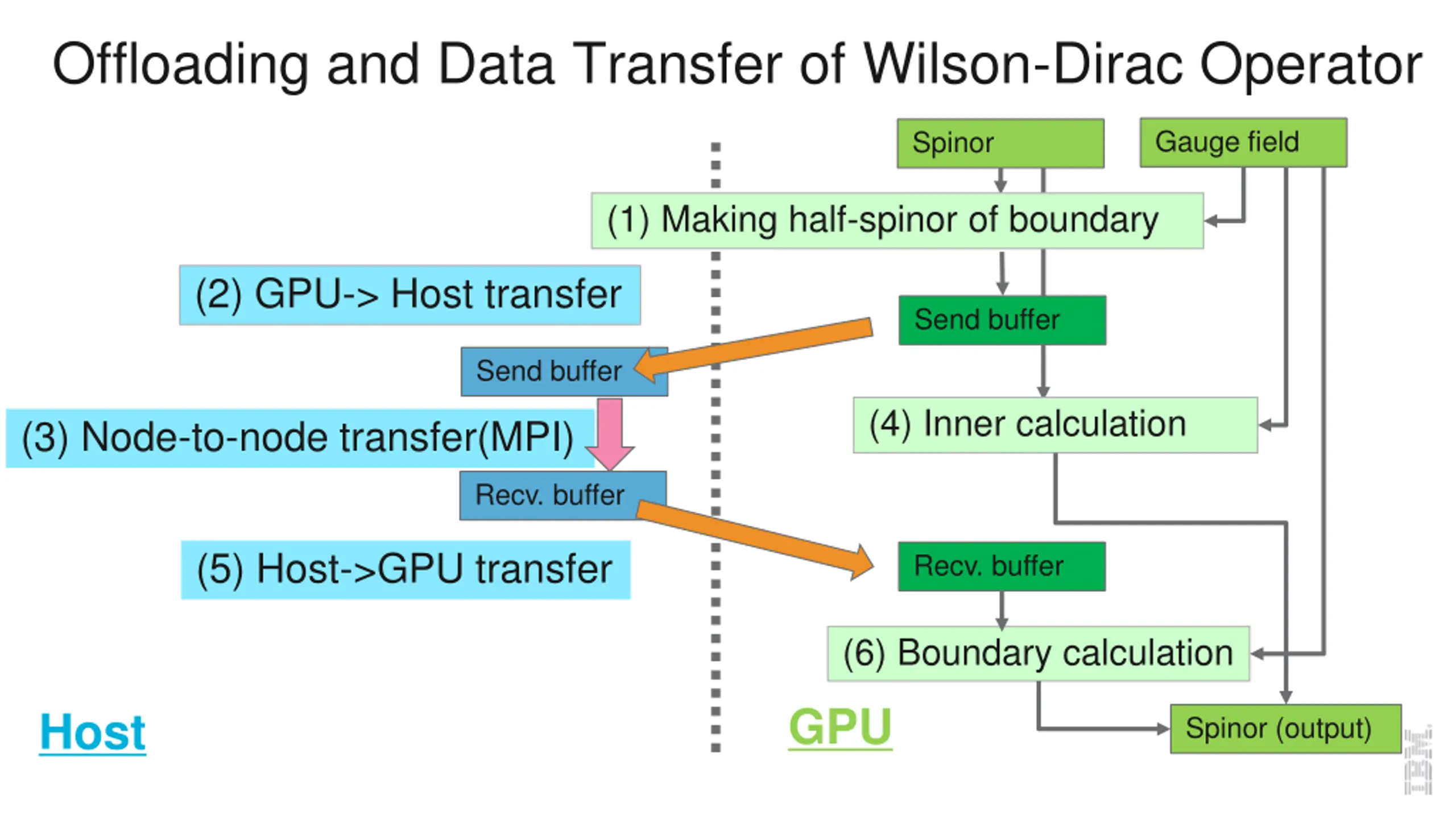 Offloading and Data Transfer of Wilson-Dirac Operator Gauge field Spinor (1) Making half-spinor of boundary (2) GPU-> Host transfer Send buffer Send buffer (4) Inner calculation (3) Node-to-node transfer(MPI) Recv. buffer (5) Host->GPU transfer Recv. buffer (6) Boundary calculation GPU Host Spinor (output)