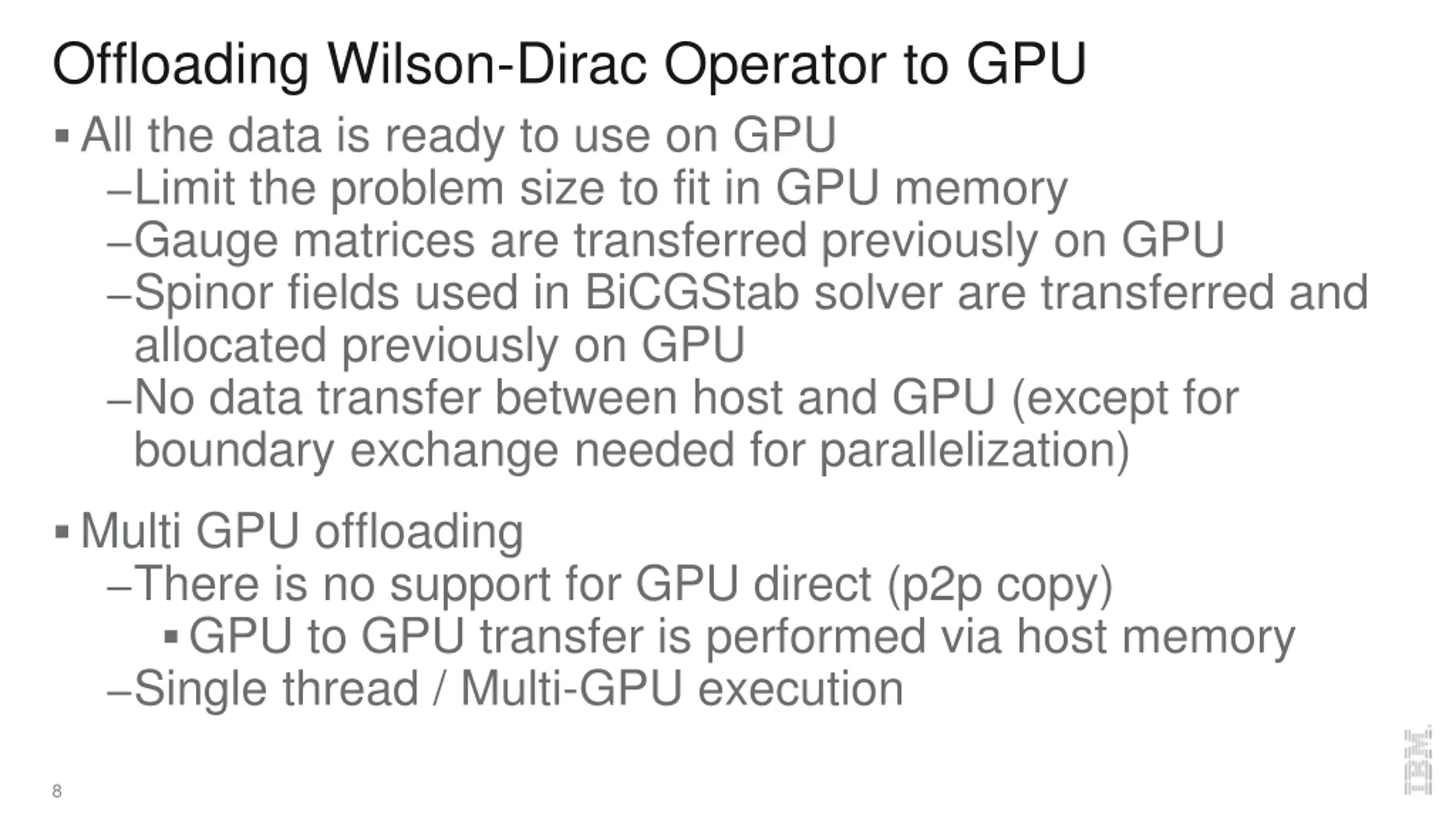Offloading Wilson-Dirac Operator to GPU All the data is ready to use on GPU Limit the problem size to fit in GPU memory Gauge matrices are transferred previously on GPU Spinor fields used in BiCGStab solver are transferred and allocated previously on GPU No data transfer between host and GPU (except for boundary exchange needed for parallelization) Multi GPU offloading There is no support for GPU direct (p2p copy) GPU to GPU transfer is performed via host memory Single thread / Multi-GPU execution 8