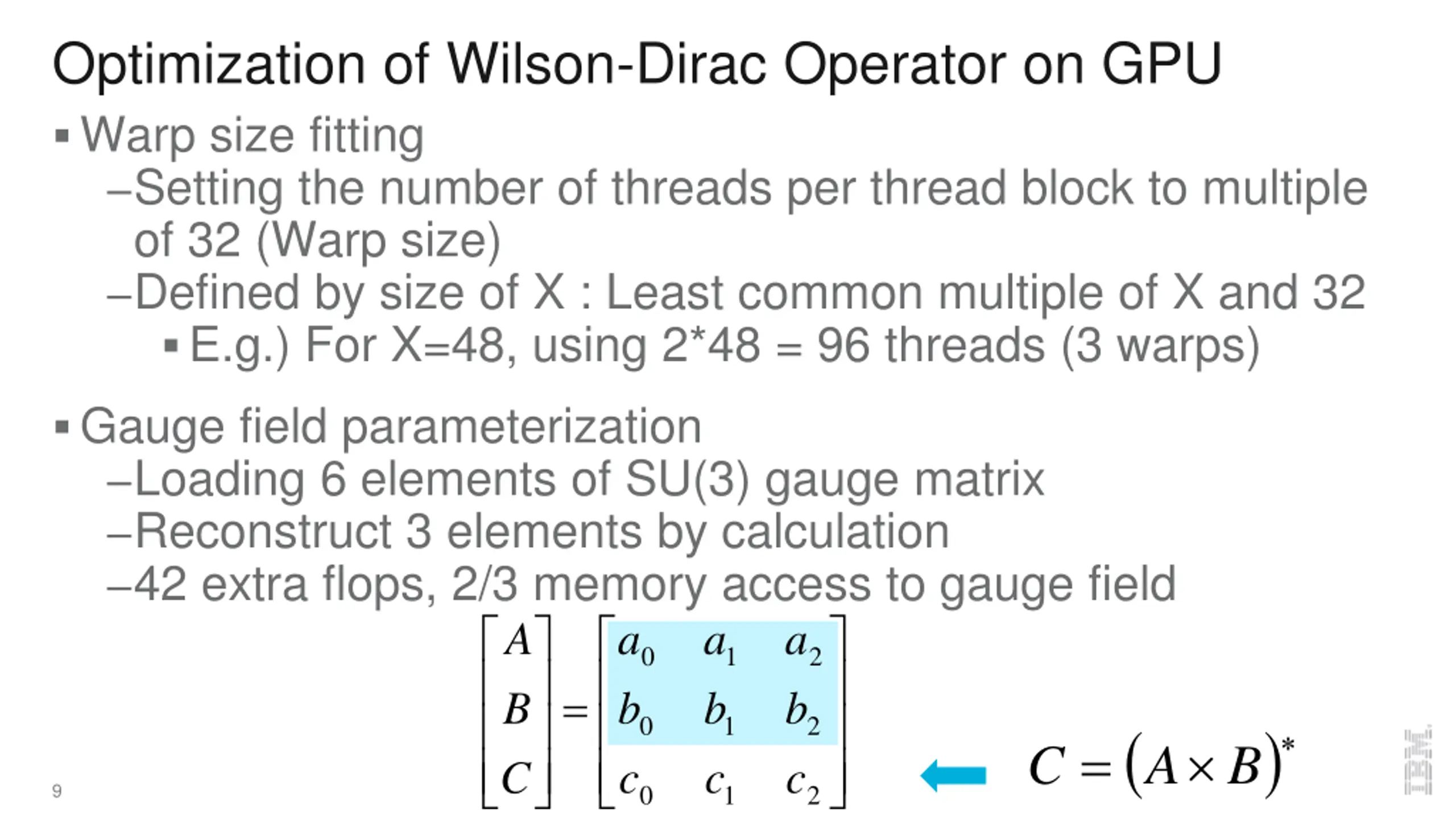 Optimization of Wilson-Dirac Operator on GPU Warp size fitting Setting the number of threads per thread block to multiple of 32 (Warp size) Defined by size of X : Least common multiple of X and 32 E.g.) For X=48, using 2*48 = 96 threads (3 warps) Gauge field parameterization Loading 6 elements of SU(3) gauge matrix Reconstruct 3 elements by calculation 42 extra flops, 2/3 memory access to gauge field = C A a a a 0 1 2 B b b b ( ) 0 1 2 = C A B c c c 0 1 2 9