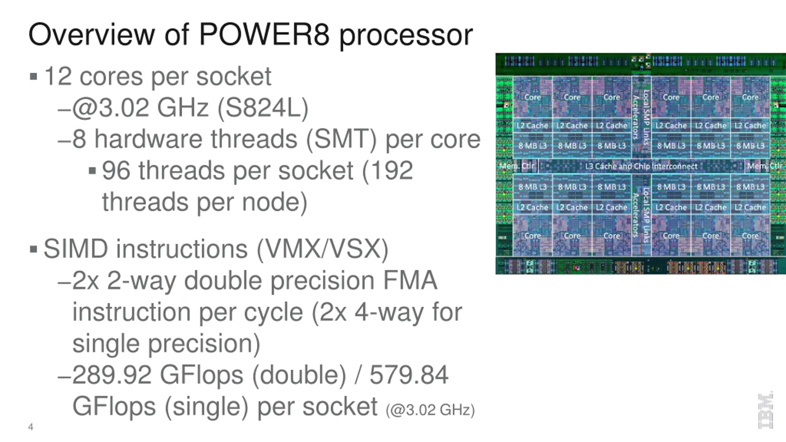 Overview of POWER8 processor 12 cores per socket @3.02 GHz (S824L) 8 hardware threads (SMT) per core 96 threads per socket (192 threads per node) SIMD instructions (VMX/VSX) 2x 2-way double precision FMA instruction per cycle (2x 4-way for single precision) 289.92 GFlops (double) / 579.84 GFlops (single) per socket (@3.02 GHz) 4
