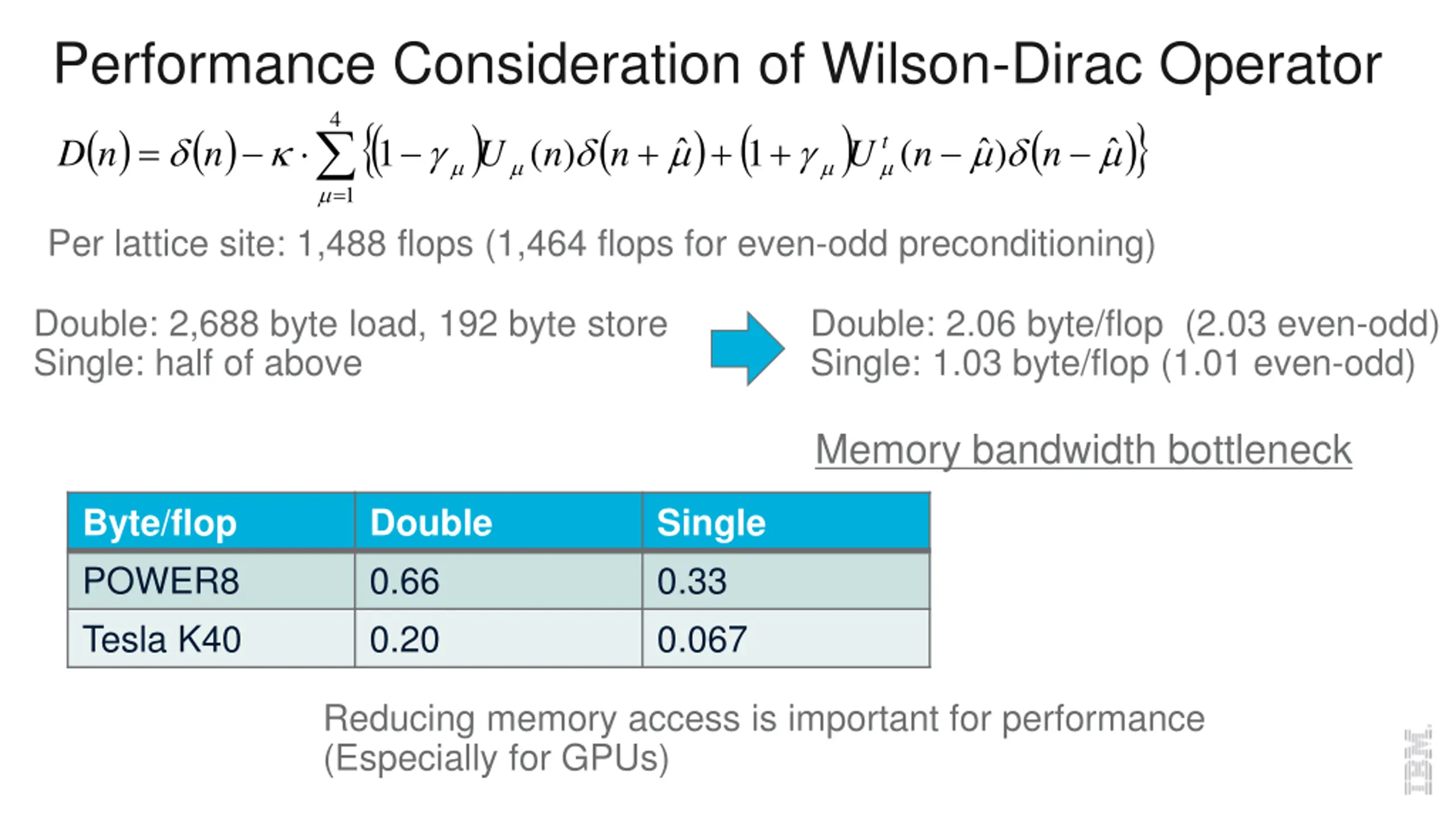 Performance Consideration of Wilson-Dirac Operator ( ) ( ) ( ( = 1 Per lattice site: 1,488 flops (1,464 flops for even-odd preconditioning) ) U ) ( + ) U 4 ( ) = + + ) t 1 ( ) 1 ( D n n n n n n Double: 2,688 byte load, 192 byte store Single: half of above Double: 2.06 byte/flop (2.03 even-odd) Single: 1.03 byte/flop (1.01 even-odd) Memory bandwidth bottleneck Byte/flop POWER8 Tesla K40 Double 0.66 0.20 Single 0.33 0.067 Reducing memory access is important for performance (Especially for GPUs)