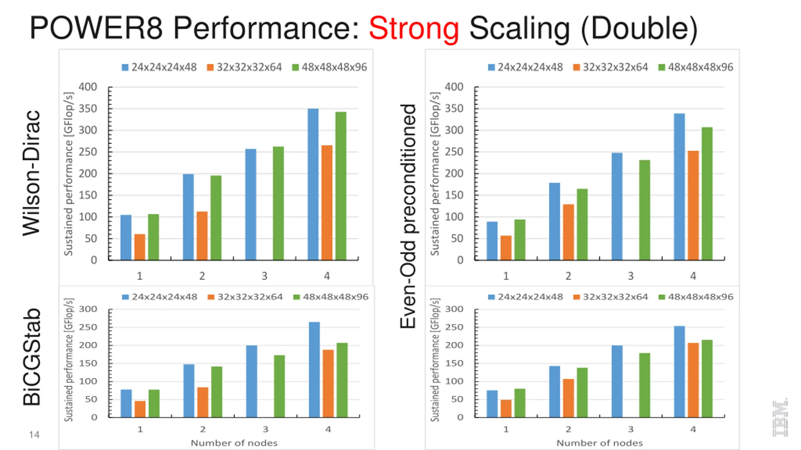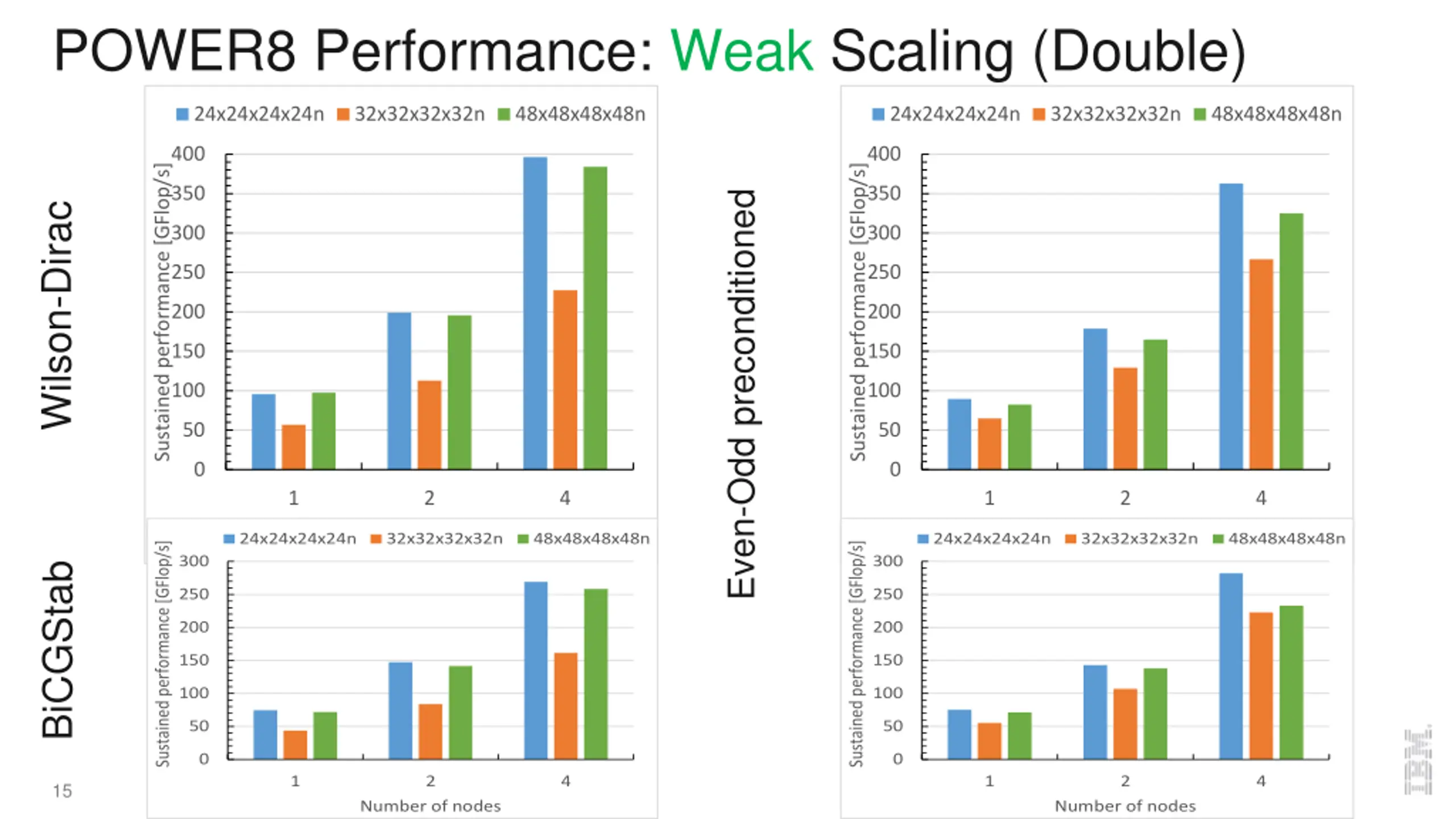 POWER8 Performance: Weak Scaling (Double) 24x24x24x24n 32x32x32x32n 48x48x48x48n 24x24x24x24n 32x32x32x32n 48x48x48x48n 400 400 Sustained performance [GFlop/s] Sustained performance [GFlop/s] 350 350 Even-Odd preconditioned Wilson-Dirac 300 300 250 250 200 200 150 150 100 100 50 50 0 0 1 2 4 1 2 4 Number of nodes 32x32x32x32n Number of nodes 32x32x32x32n 24x24x24x24n 48x48x48x48n 24x24x24x24n 48x48x48x48n Sustained performance [GFlop/s] Sustained performance [GFlop/s] 300 300 BiCGStab 250 250 200 200 150 150 100 100 50 50 0 0 1 2 4 1 2 4 15 Number of nodes Number of nodes