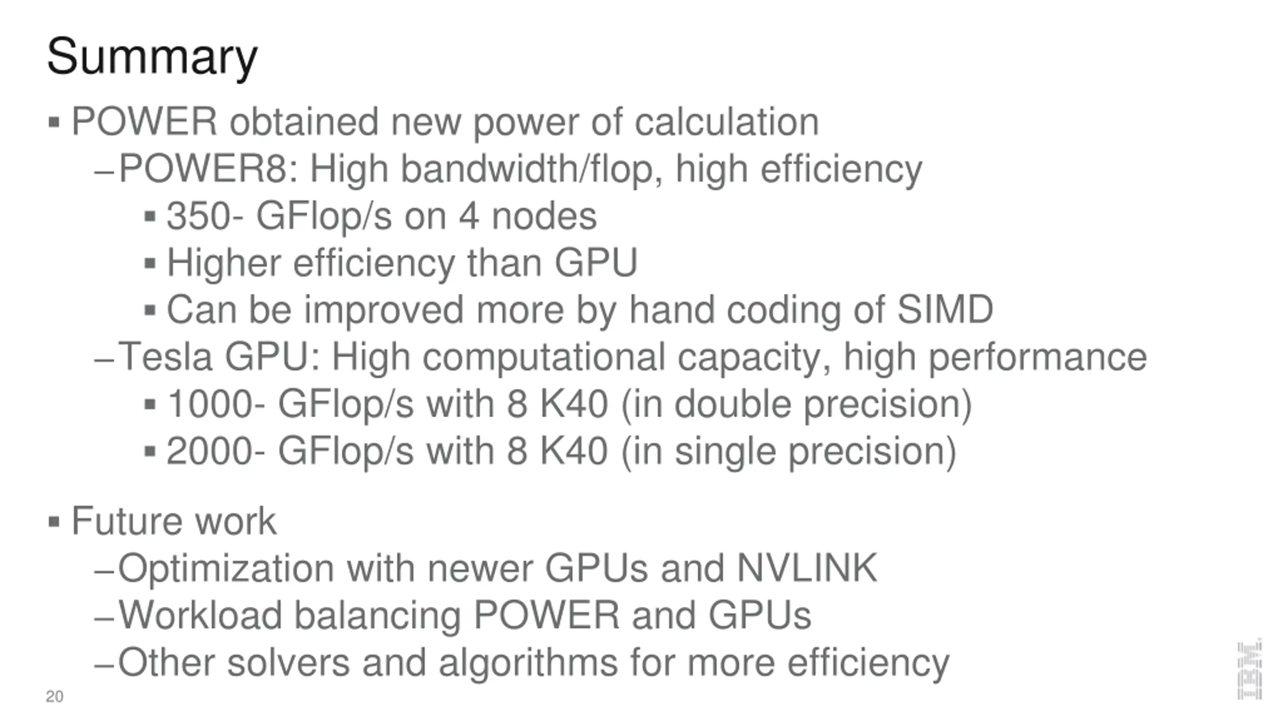 Summary POWER obtained new power of calculation POWER8: High bandwidth/flop, high efficiency 350- GFlop/s on 4 nodes Higher efficiency than GPU Can be improved more by hand coding of SIMD Tesla GPU: High computational capacity, high performance 1000- GFlop/s with 8 K40 (in double precision) 2000- GFlop/s with 8 K40 (in single precision) Future work Optimization with newer GPUs and NVLINK Workload balancing POWER and GPUs Other solvers and algorithms for more efficiency 20