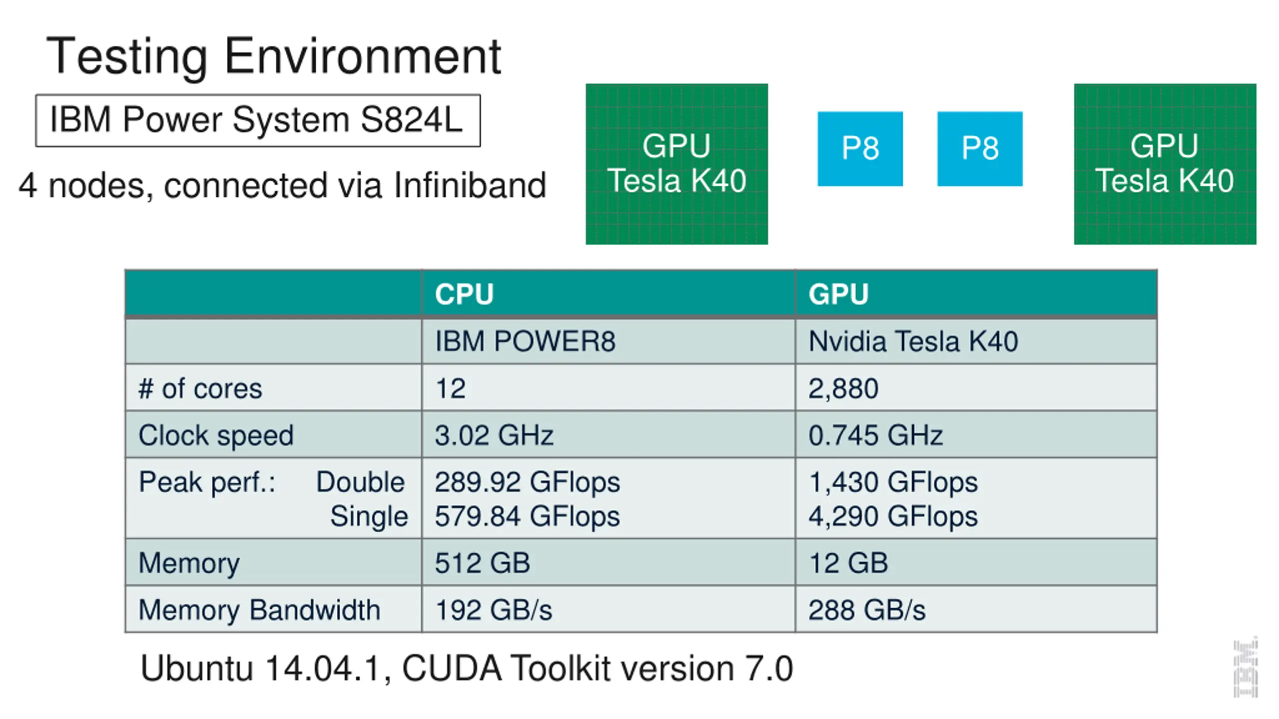 Testing Environment IBM Power System S824L GPU GPU P8 P8 Tesla K40 Tesla K40 4 nodes, connected via Infiniband CPU IBM POWER8 12 3.02 GHz 289.92 GFlops 579.84 GFlops 512 GB 192 GB/s GPU Nvidia Tesla K40 2,880 0.745 GHz 1,430 GFlops 4,290 GFlops 12 GB 288 GB/s # of cores Clock speed Peak perf.: Double Single Memory Memory Bandwidth Ubuntu 14.04.1, CUDA Toolkit version 7.0