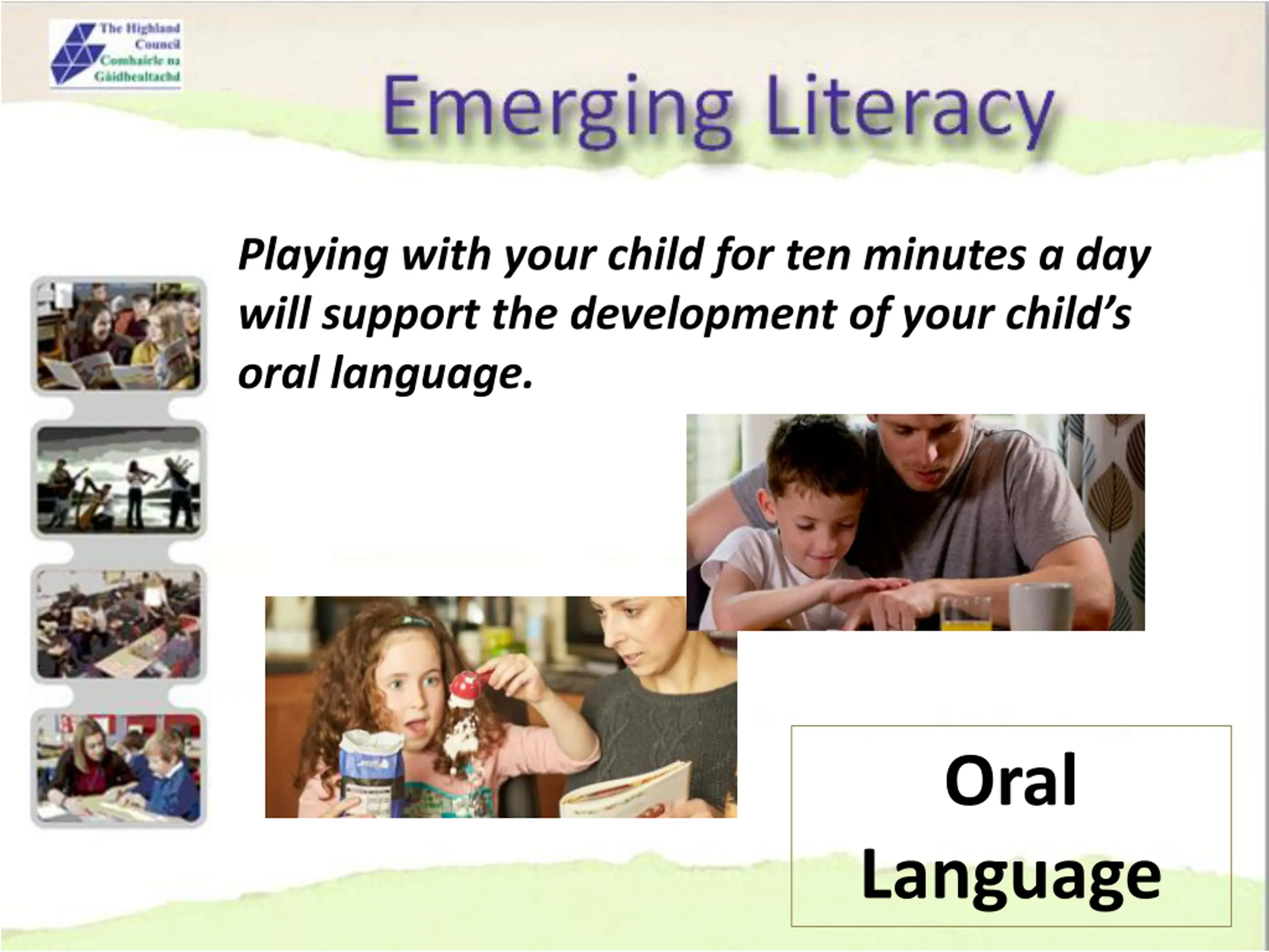 Playing with your child for ten minutes a day will support the development of your child s oral language. Oral Language