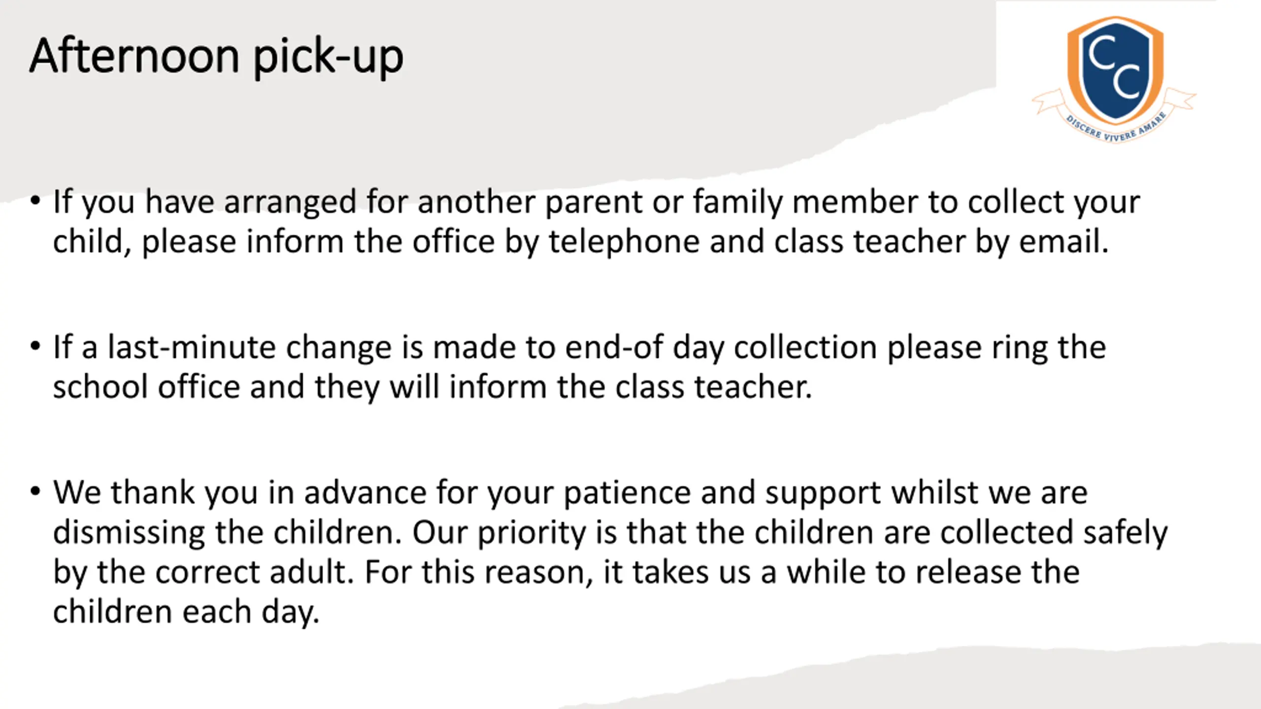 Afternoon pick Afternoon pick- -up up If you have arranged for another parent or family member to collect your child, please inform the office by telephone and class teacher by email. If a last-minute change is made to end-of day collection please ring the school office and they will inform the class teacher. We thank you in advance for your patience and support whilst we are dismissing the children. Our priority is that the children are collected safely by the correct adult. For this reason, it takes us a while to release the children each day.