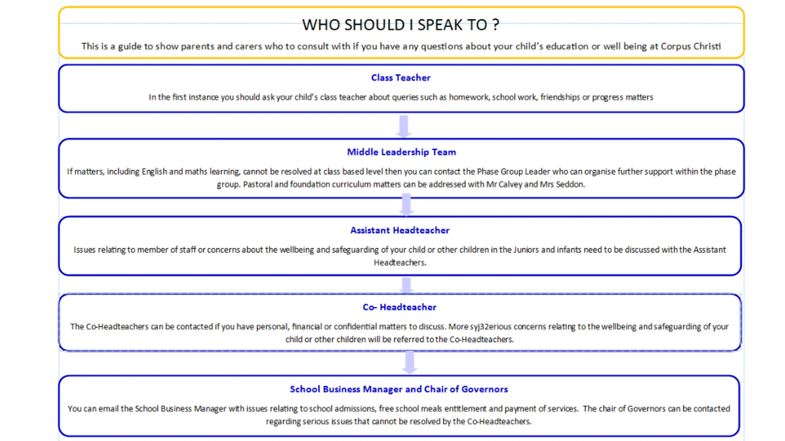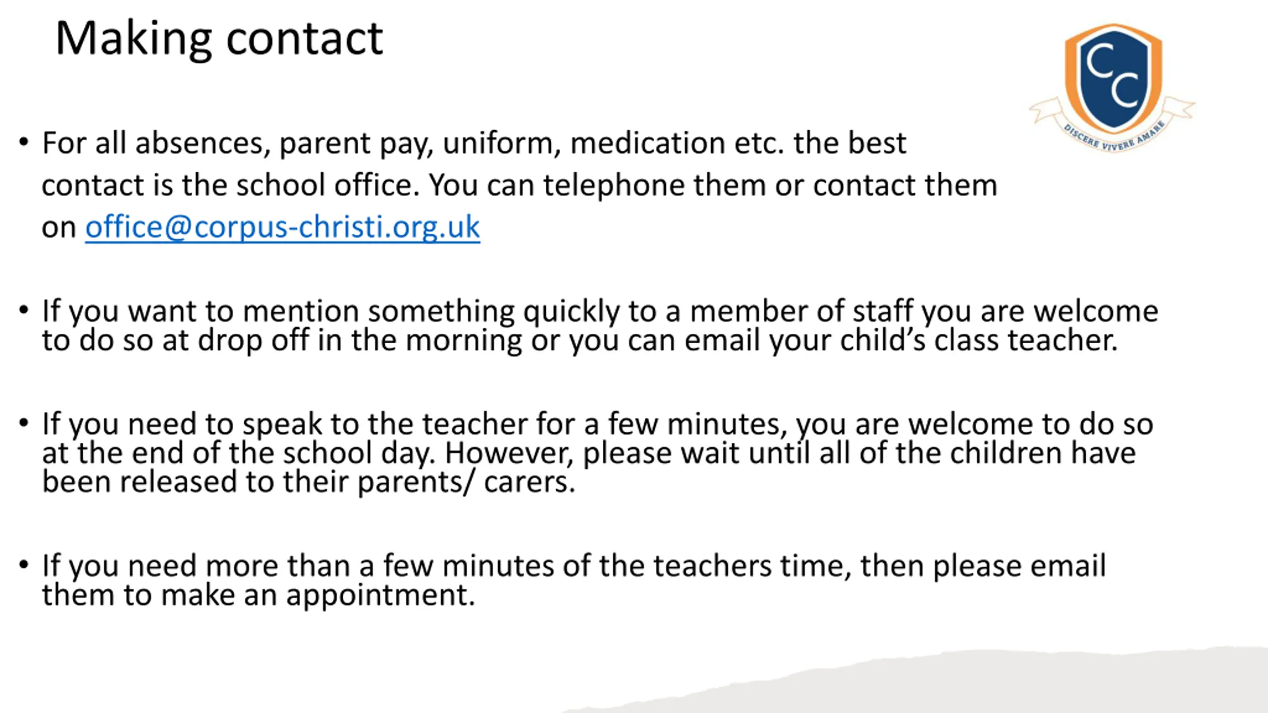 Making contact For all absences, parent pay, uniform, medication etc. the best contact is the school office. You can telephone them or contact them on office@corpus-christi.org.uk If you want to mention something quickly to a member of staff you are welcome to do so at drop off in the morning or you can email your child s class teacher. If you need to speak to the teacher for a few minutes, you are welcome to do so at the end of the school day. However, please wait until all of the children have been released to their parents/ carers. If you need more than a few minutes of the teachers time, then please email them to make an appointment.
